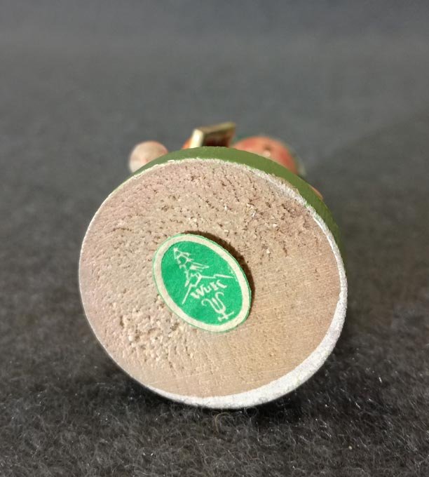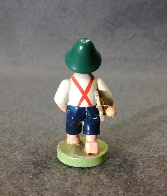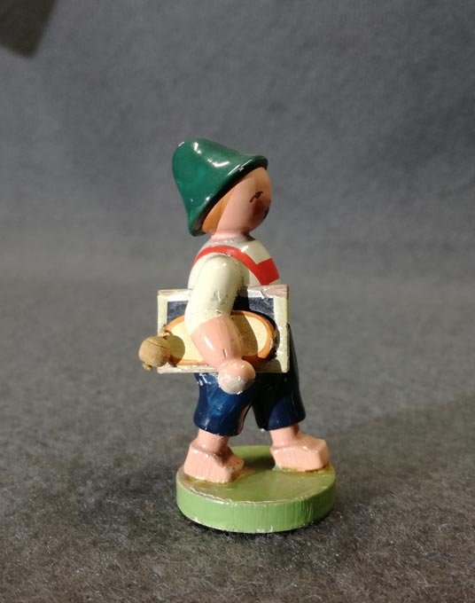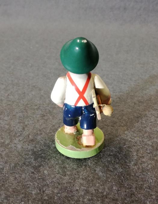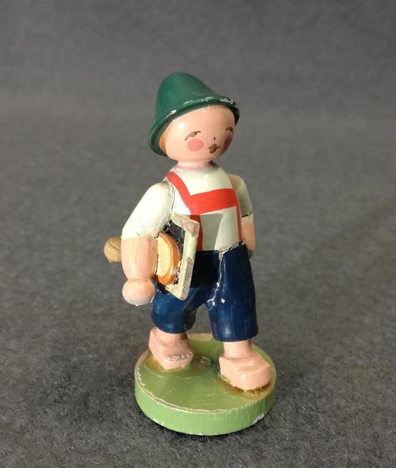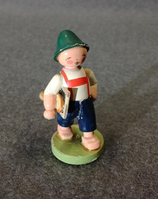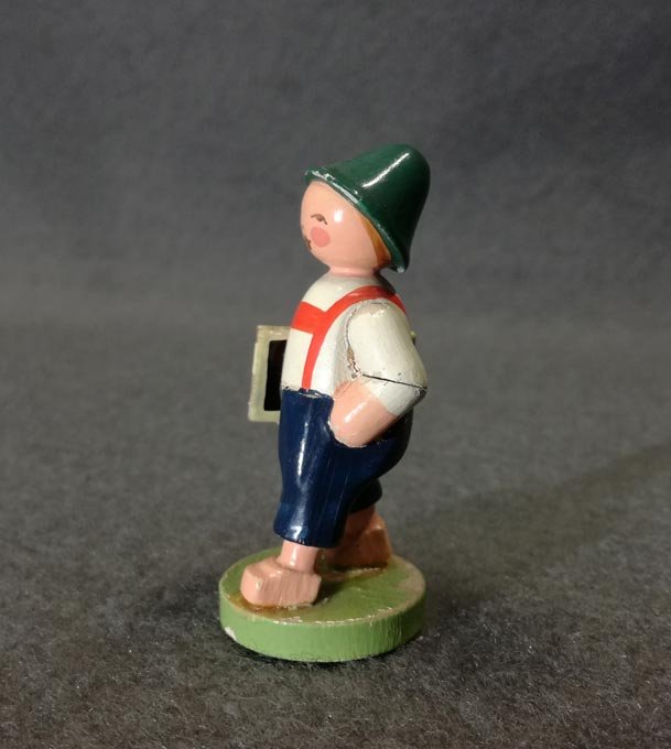 Schuljunge mit Schiefertafel. Original Wendt und Kühn Etikett. Zustand mit leichten Alterspuren, siehe detailierte Fotos. H. ca 6,5 cm