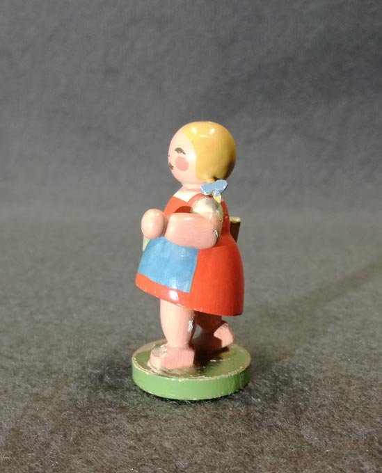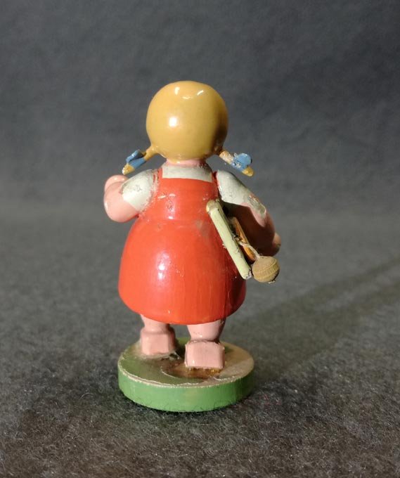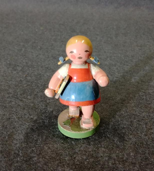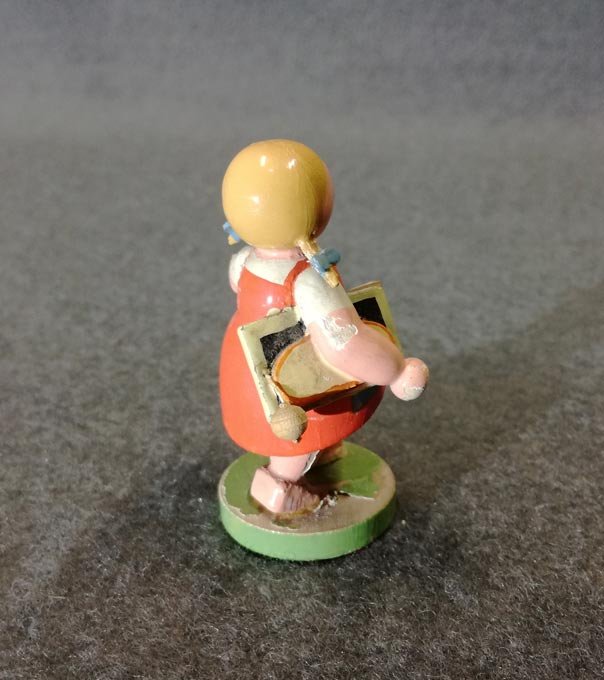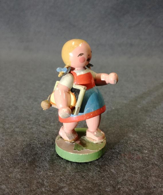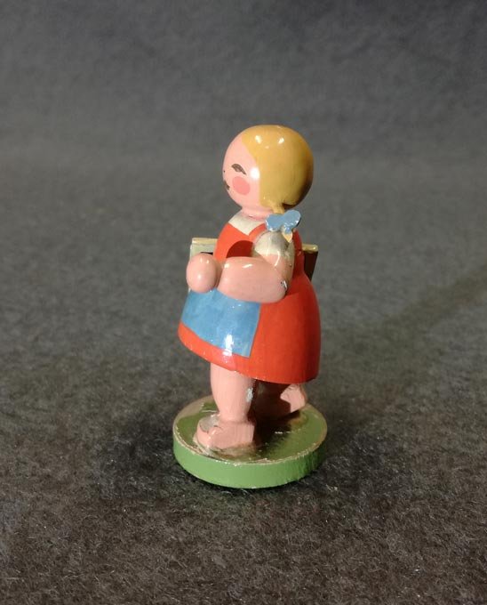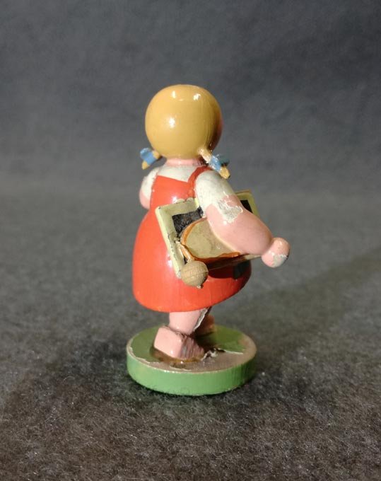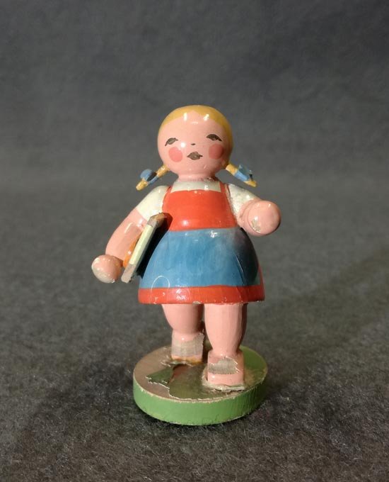 Schulmädchen mit Schiefertafel. Original Wendt und Kühn Etikett. Zustand mit leichten Alterspuren, siehe detailierte Fotos. H. ca 6 cm