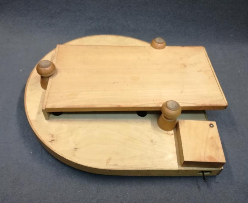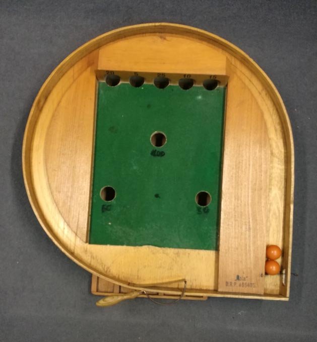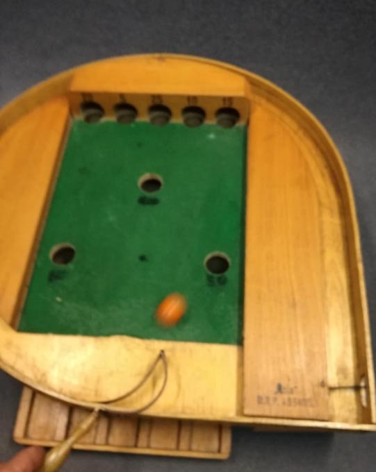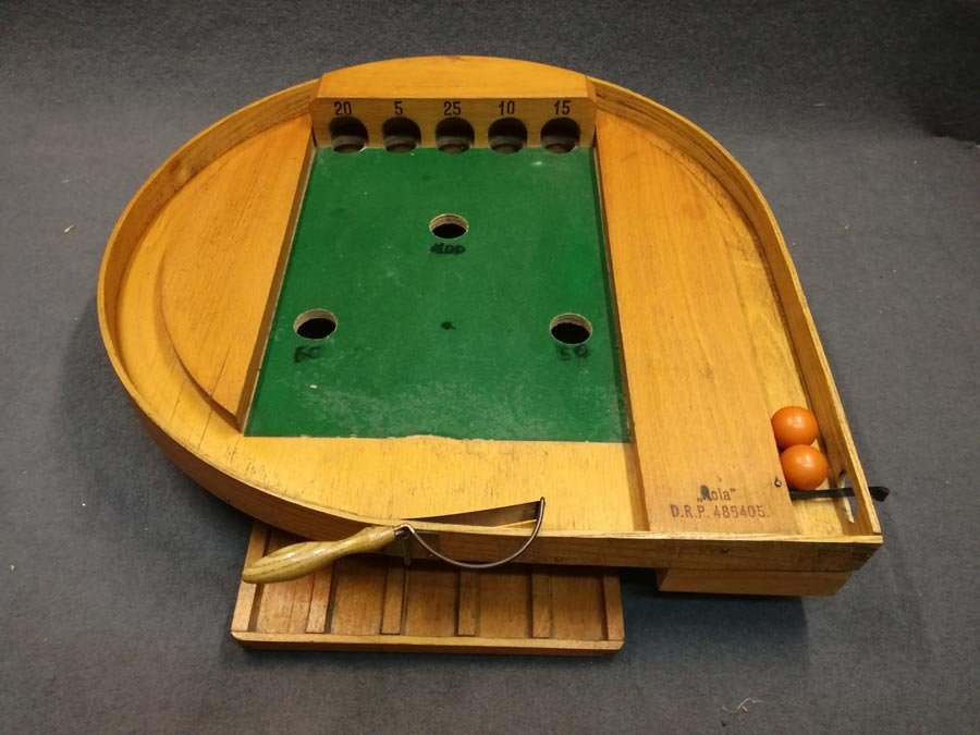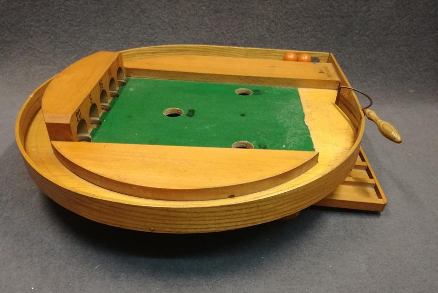 Geselschafts und Kneipenspiel, 1920er Jahre. Die Kugel wird mittels Federmechanismus in die Spielfläche geschossen. Mit dem Hebel unten kann man die Richtung der Kugel beeinflussen und diese durch die Tore oder Löcher des Spielfeldes befördern und so Punkte sammeln.