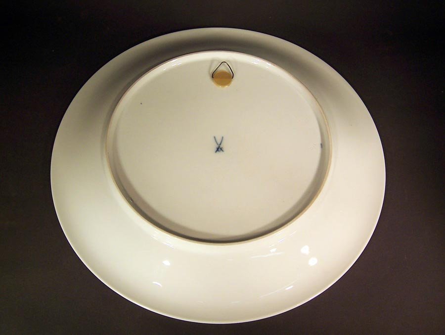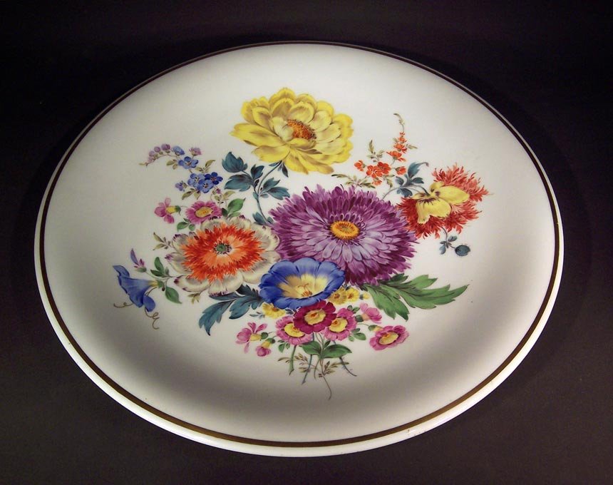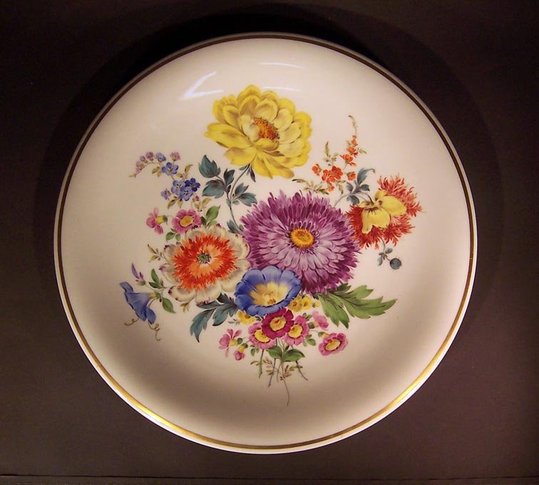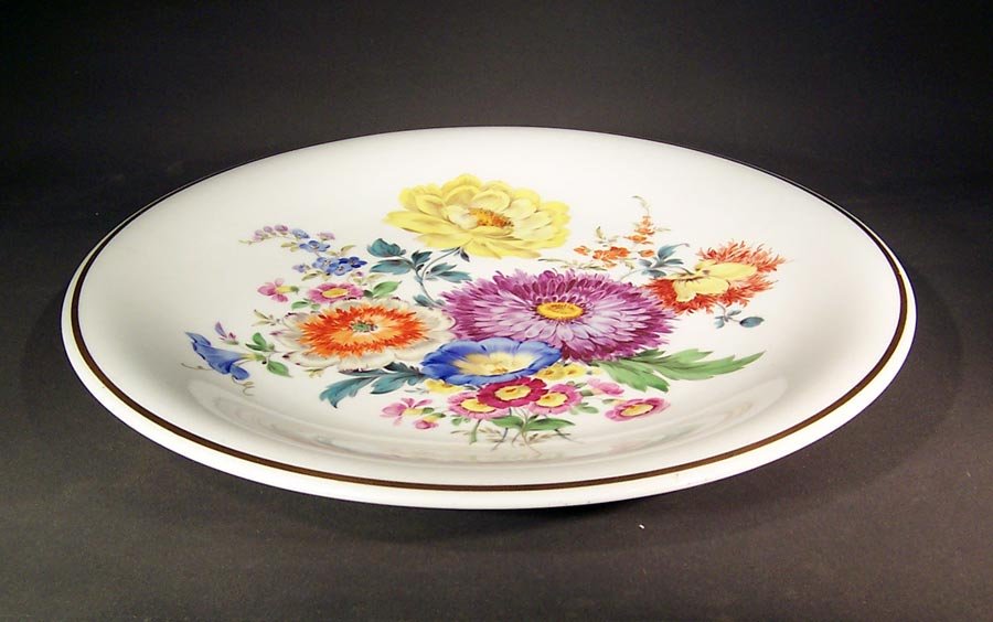 Meissen; großer Wandteller. Reiche und feine Blumenmalerei mit Goldrand.