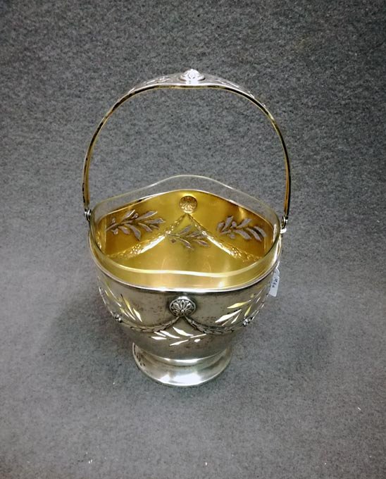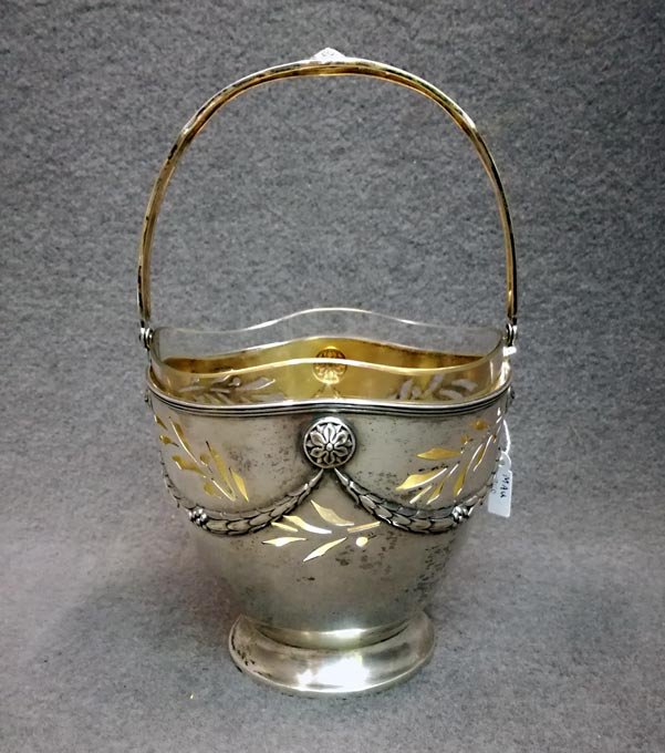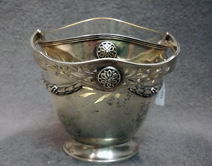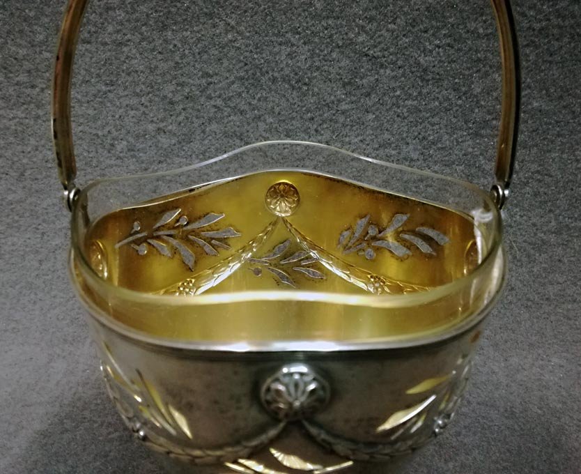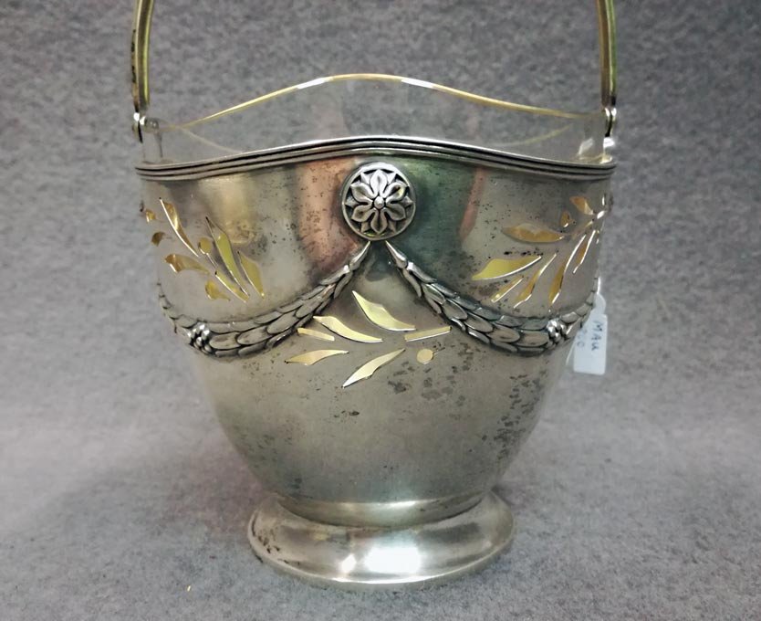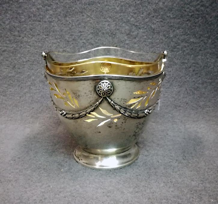 Reserviert! Konfektschale mit Henkel und Glasensatz um 1900, H. Mau, Dresden. 830er Silber innen vergoldet, original Glaseinsatz vorhanden und ohne Beschädigung.