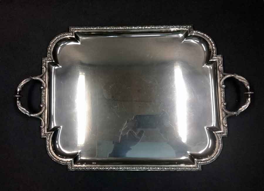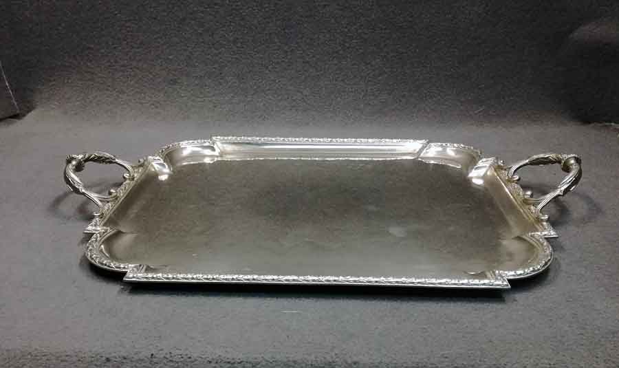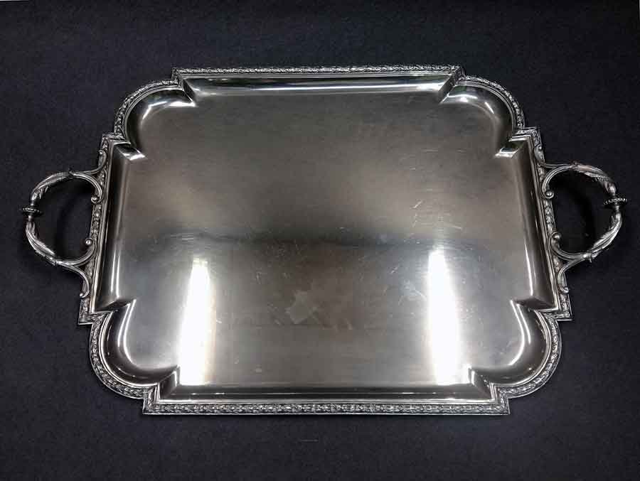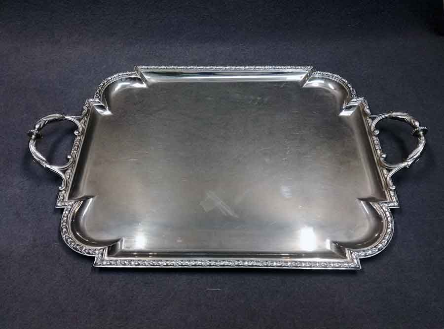 Großes, schweres Silbertablett; hochgezogener Rand, Reliefrand sehr schön verziert. Mit plastisch gearbeiteten Handhaben.