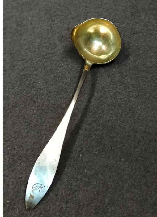 Schlichte Form mit spitz zulaufendem Griff. Der Schöpfteil innen vergoldet.