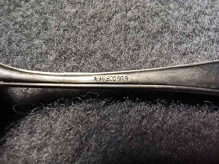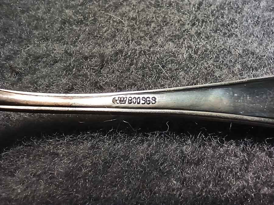 Gestempelt mit Mond, Krone und 800 (f. 800er Silber), sowie Zusatzzeichen SGS.