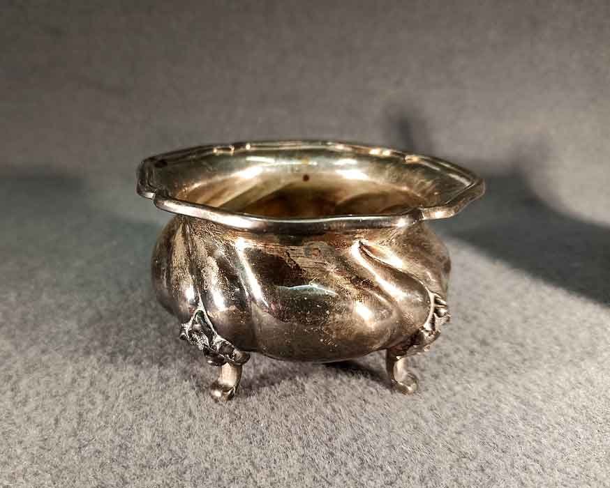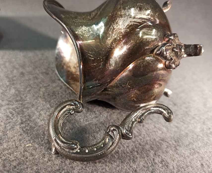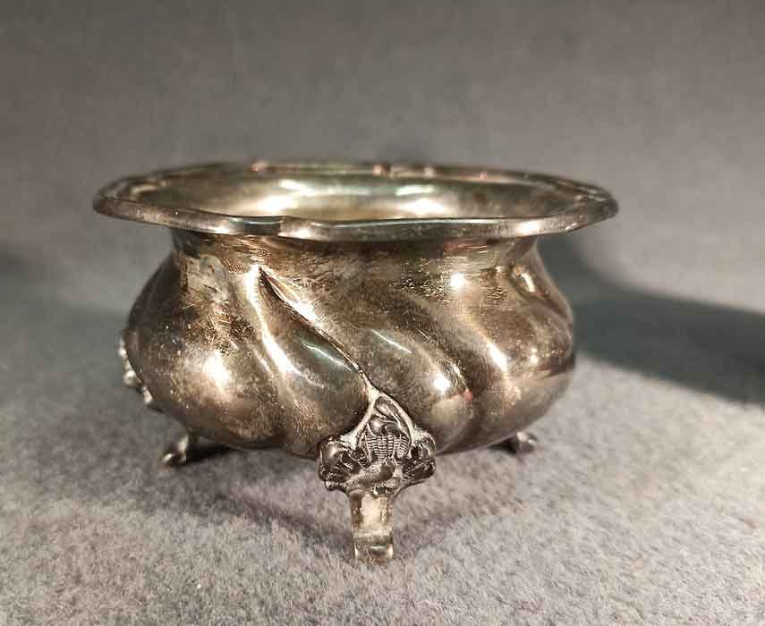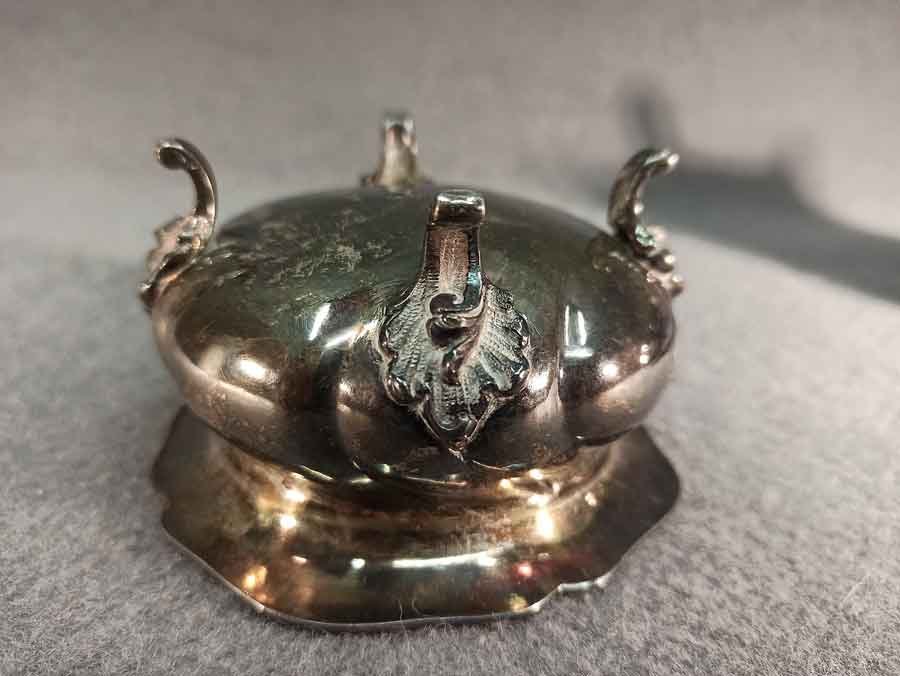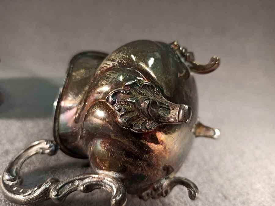Guter Zustand, nicht beschädigt oder verbeult. Ungeputzt, angelaufen, Spuren von Putzmittel in der Ziselierung.