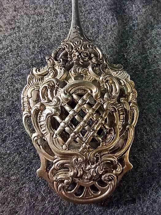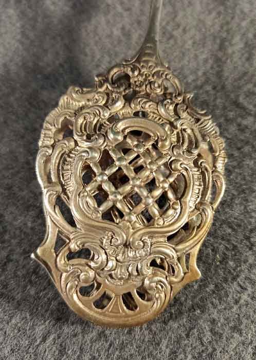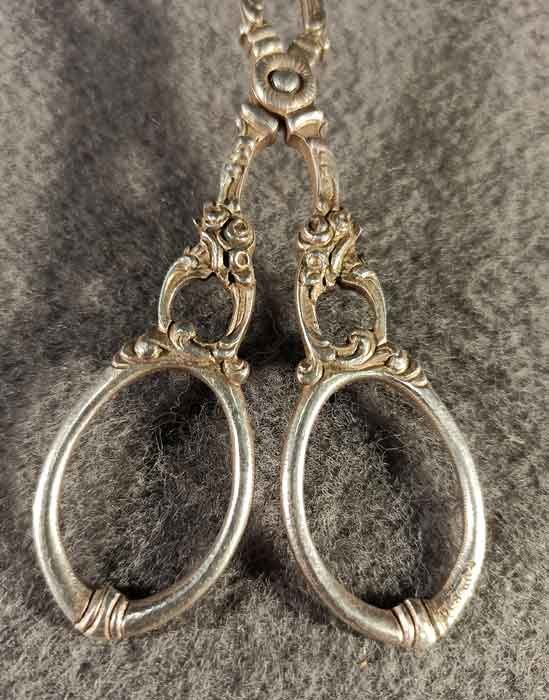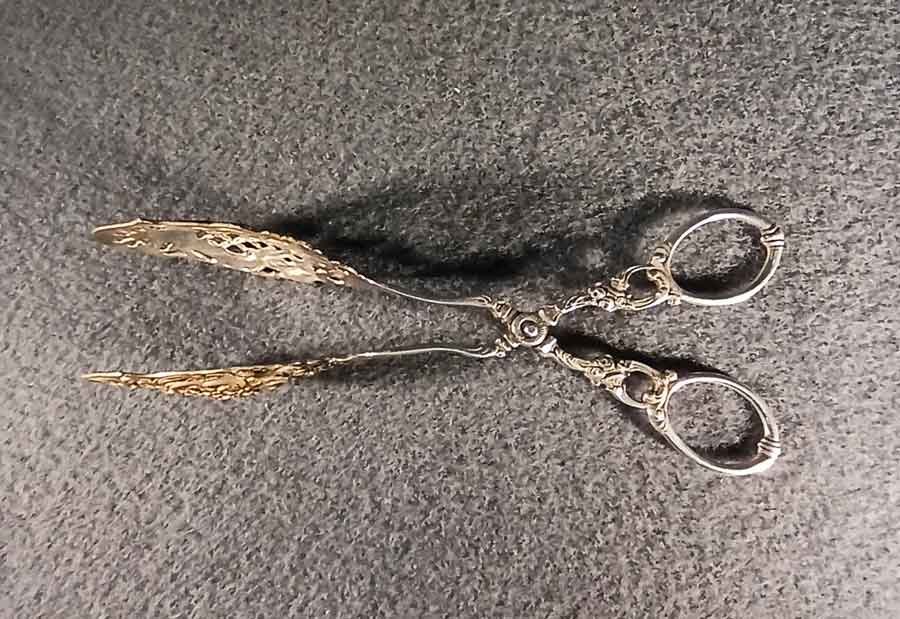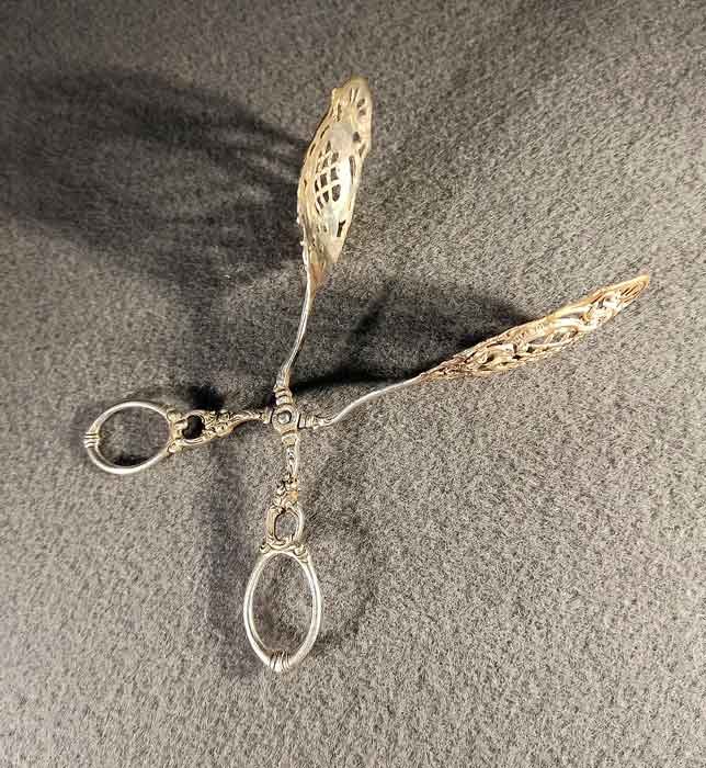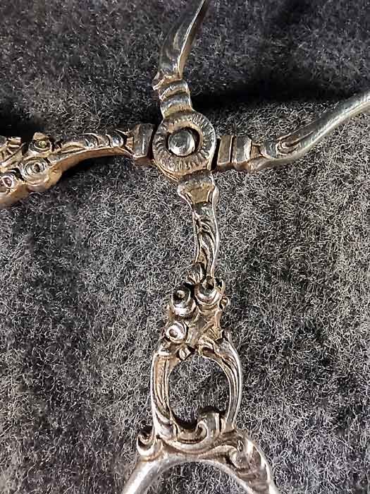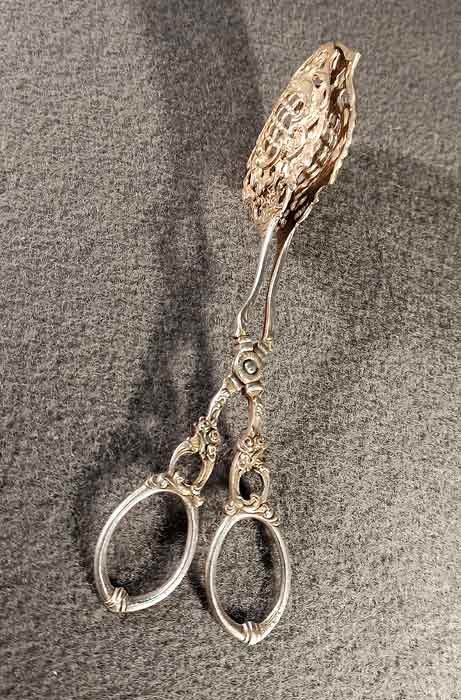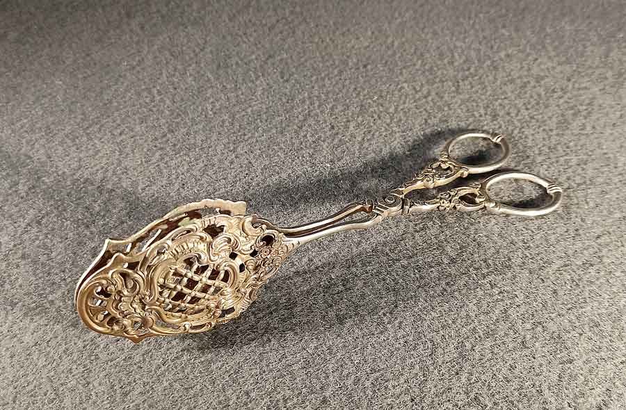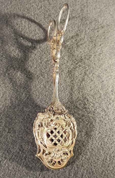 Gebäckzange, feine Silberarbeit, durchbrochen gearbeitet, aufwändiger Reliefdekor. 800er Silber gestempelt "Mond, Krone, 800" ca 70 g, L. 18,5 cm. Sehr guter Zustand.