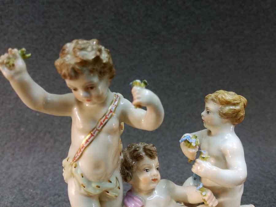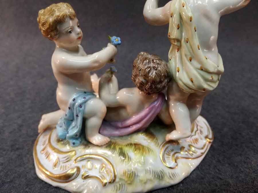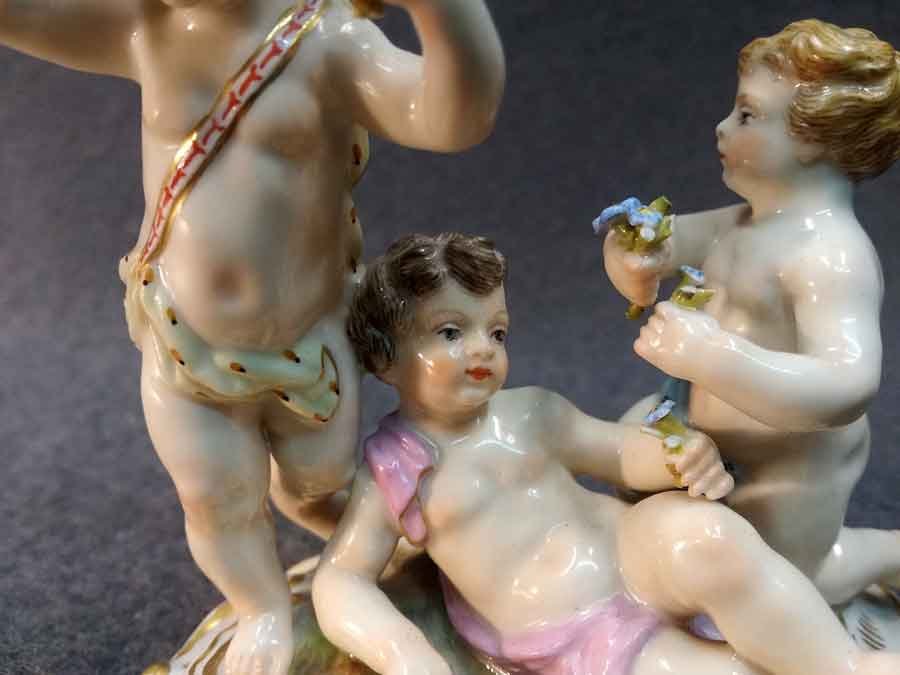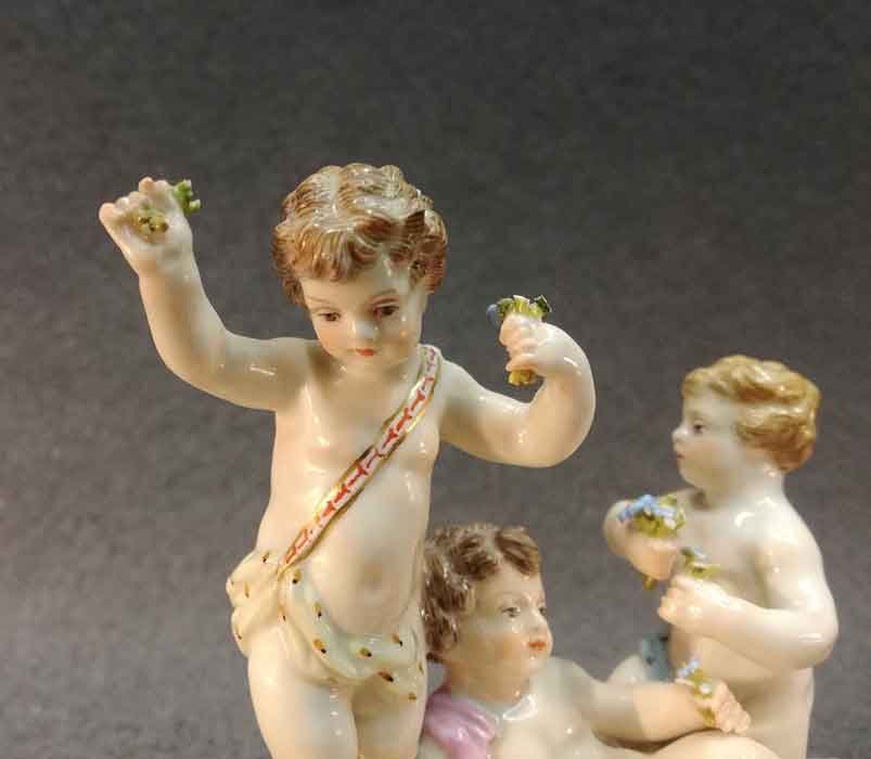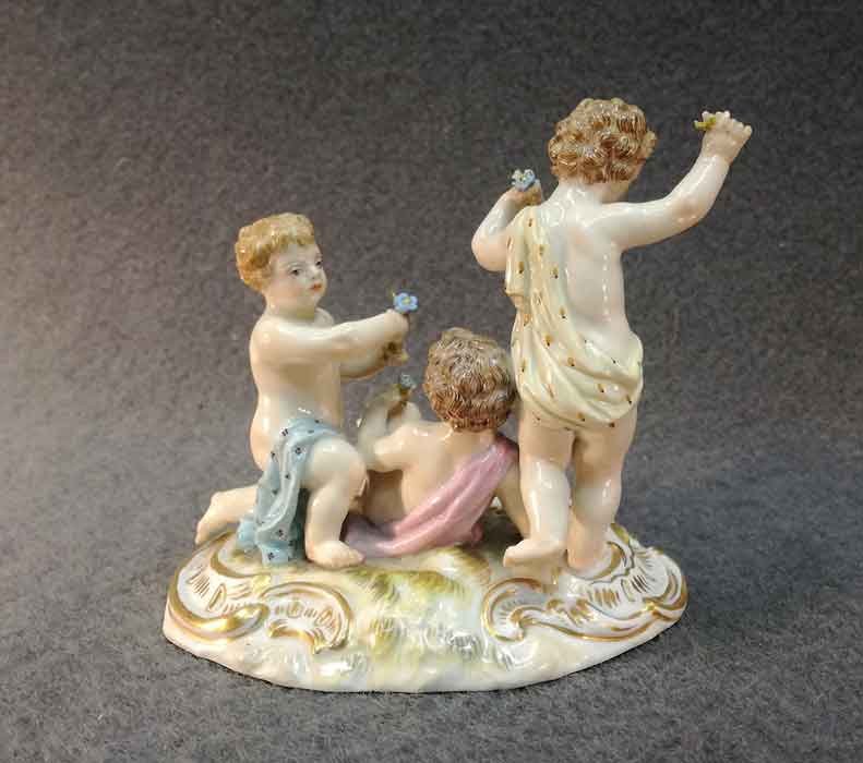 Meissen Gruppe, drei Putten, Knaben mit Blumen in idyllischer Situation.