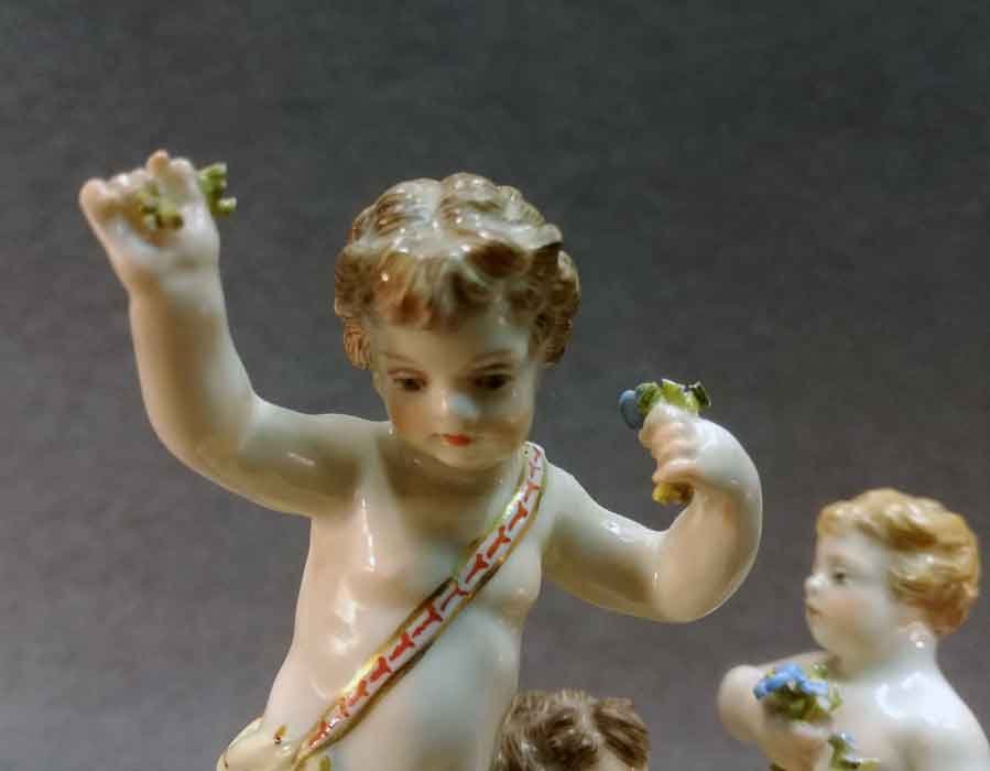 Guter Zustand. Die filigranen Blumen in den Händen der Putti teilweise bestossen. Sonst keine Beschädigungen; keine Risse, Brüche, Chips oder Abplatzer.