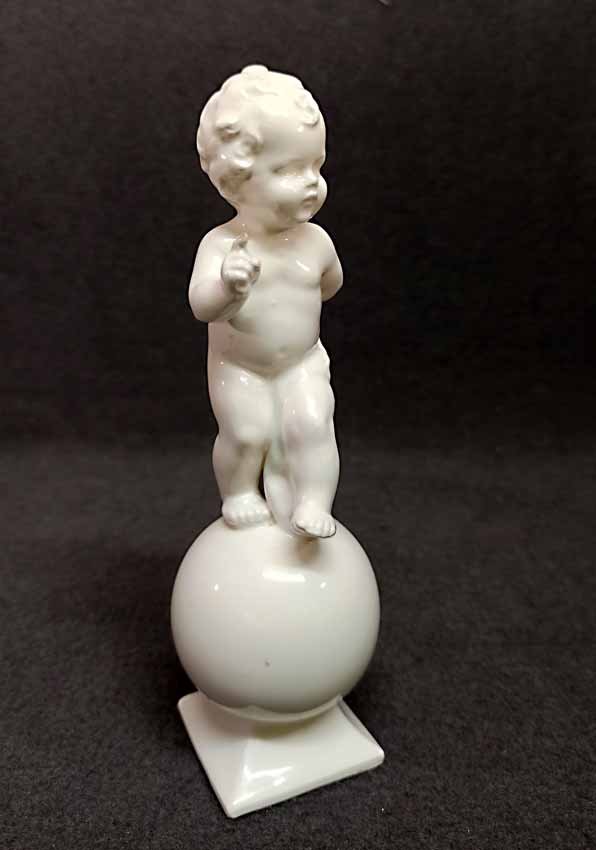 Putto auf Kugel mit belehrender Geste. Keramik Glasiert.