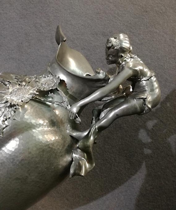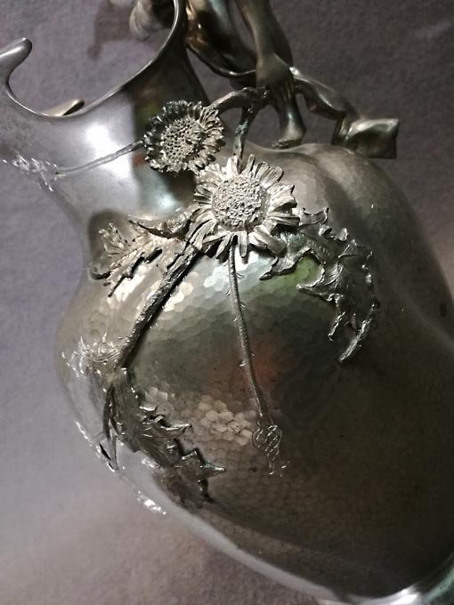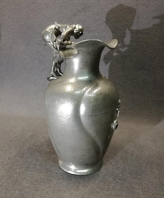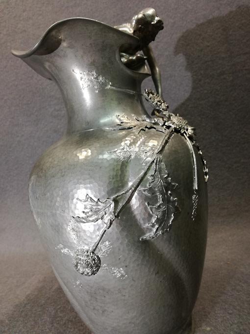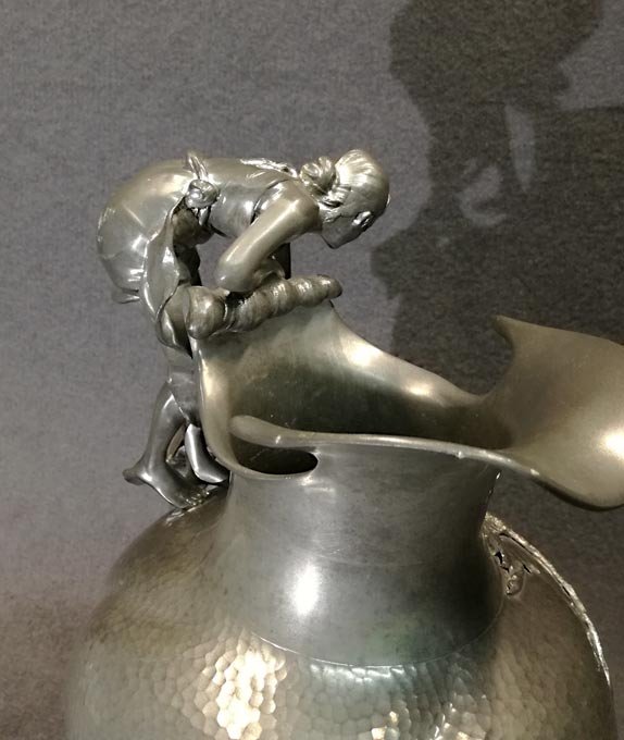 Kayserzinn, großer Krug mit Mädchen-Figur in typischer Jugendstilmanier als Handhabe sowie plastische Blüten/Pflanzen. Figur und Blüten sehr fein und detailreich gearbeitet