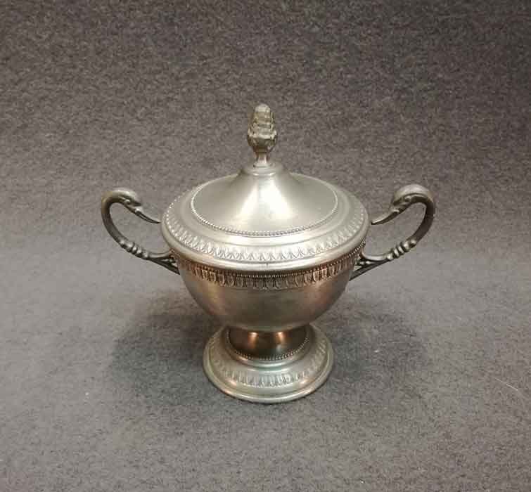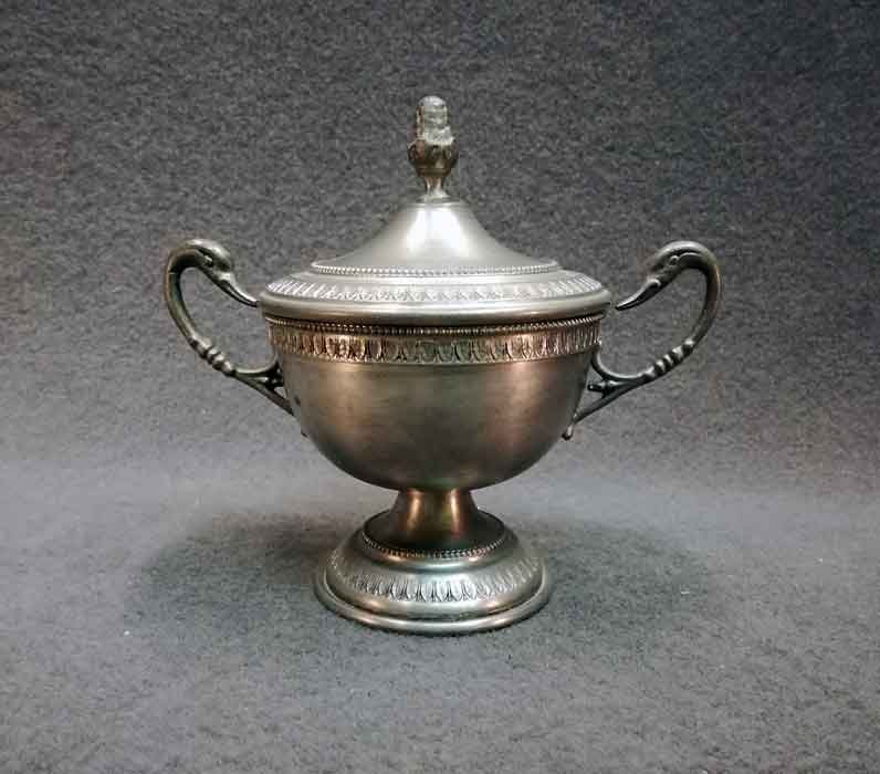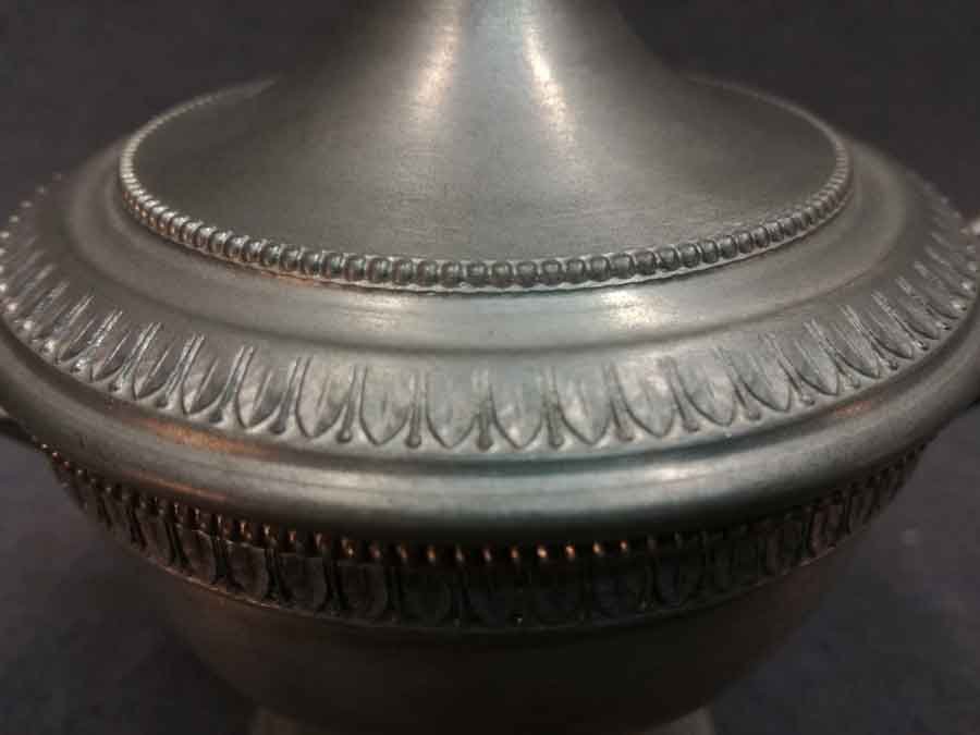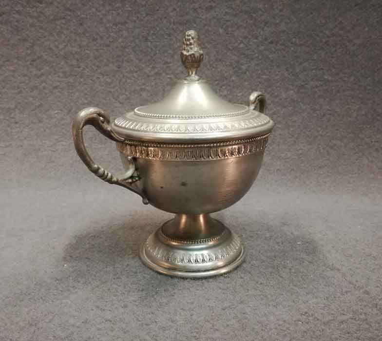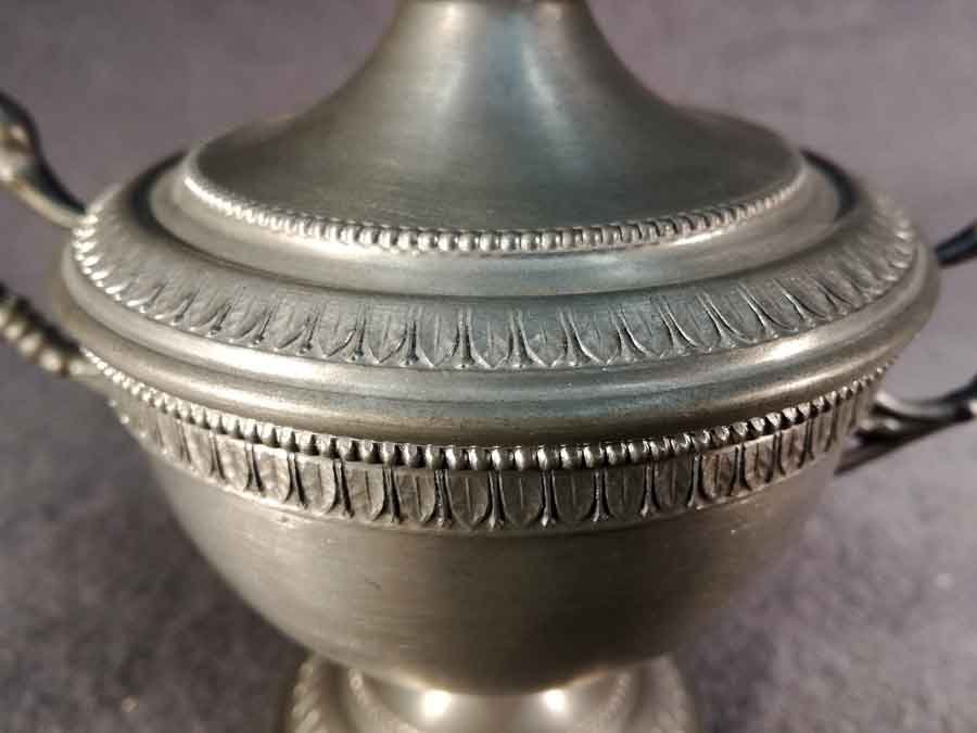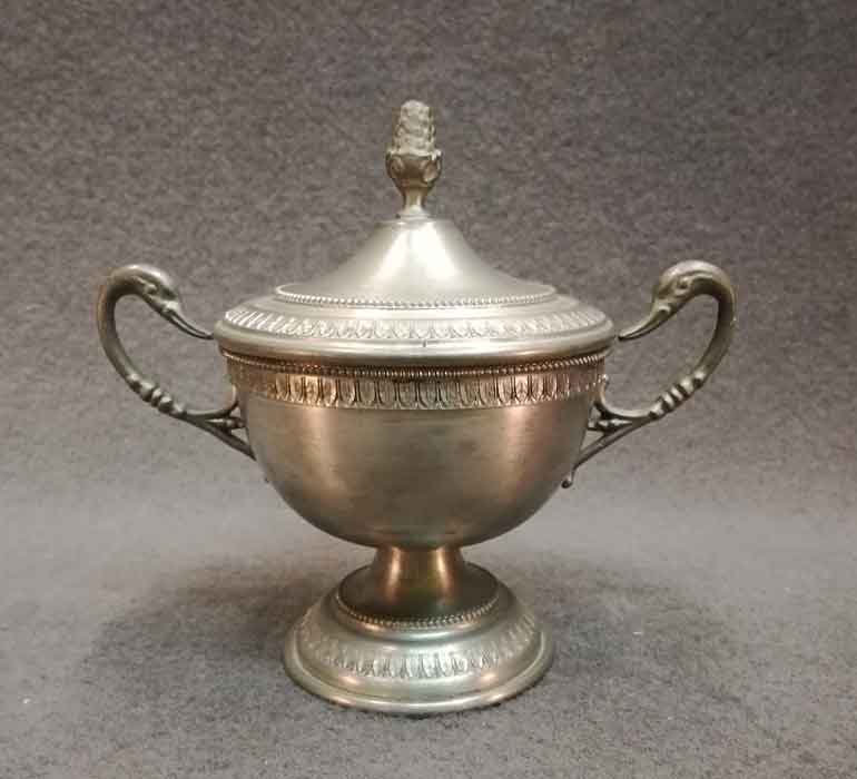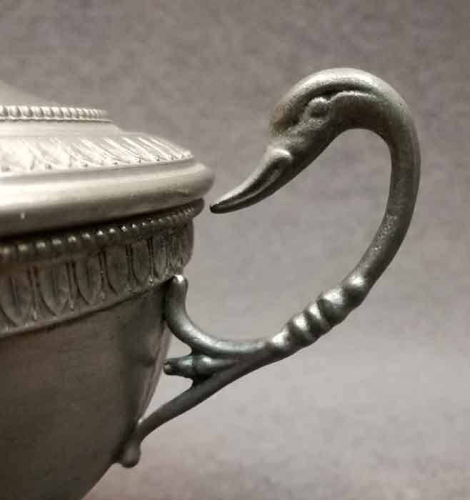 Zinndose mit Deckel u 1900 in klassizistischem Stil. Handhaben im Stil von Schwanenhälsen. Auf Deckel, Korpus und Fuß umlaufende Lorbeerblatt Bordüren und Perlringe.