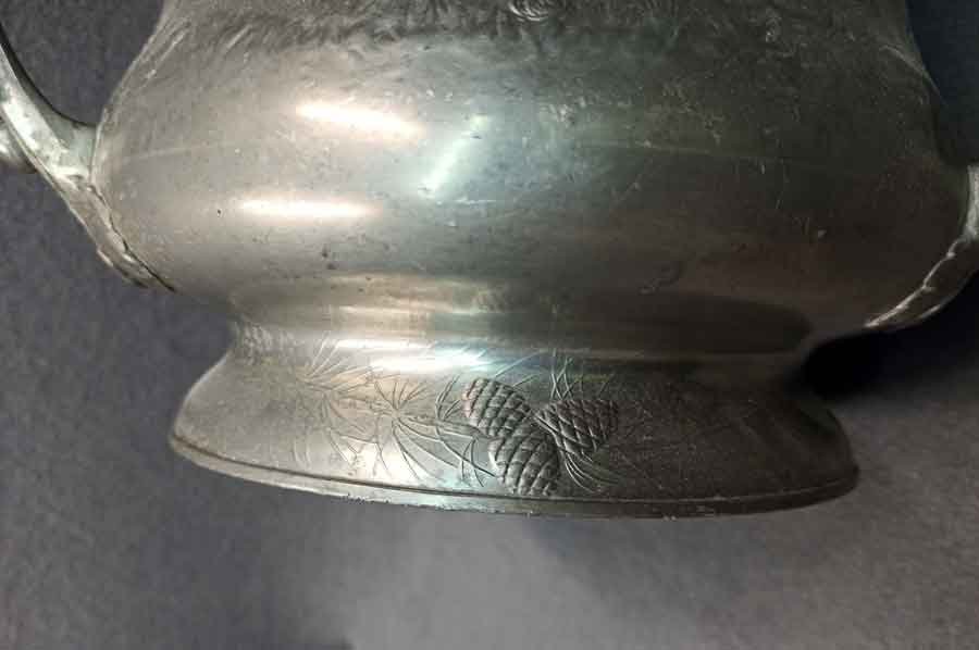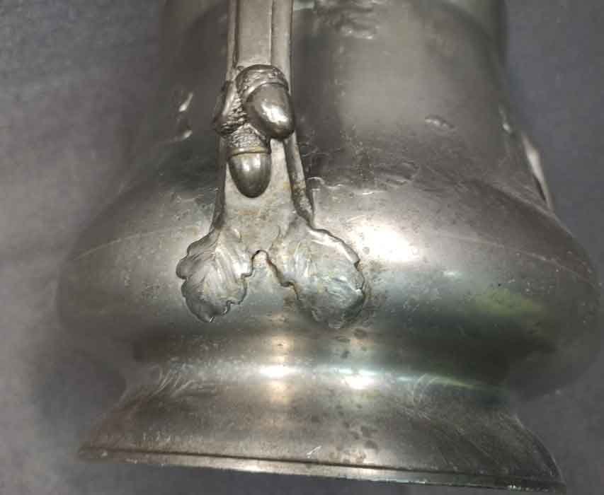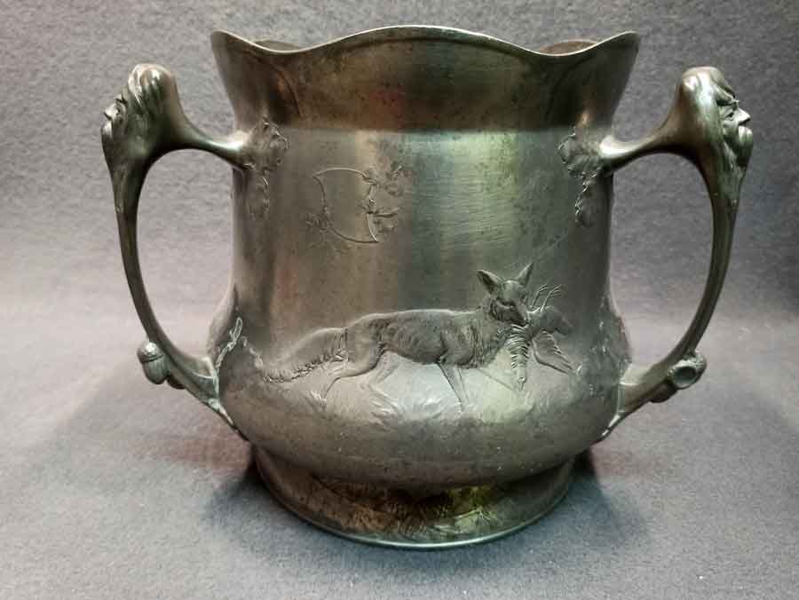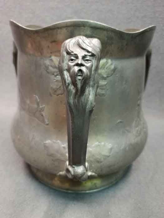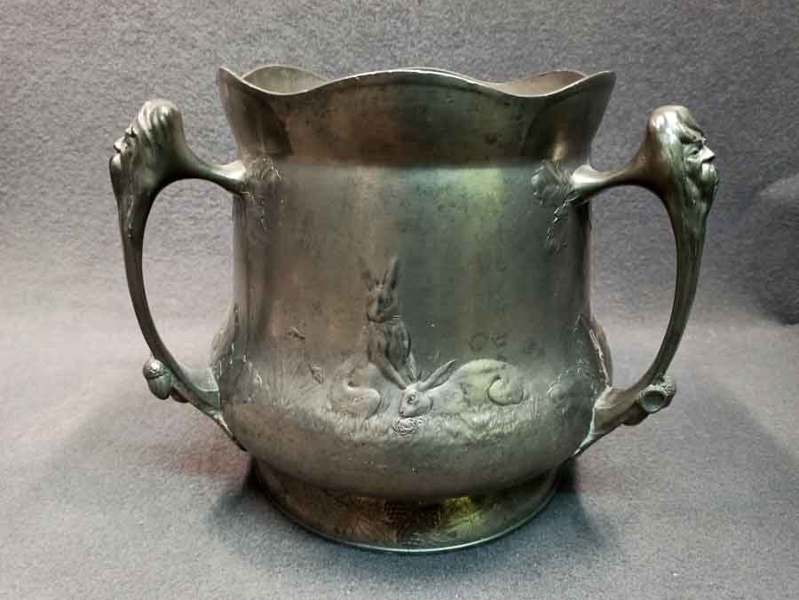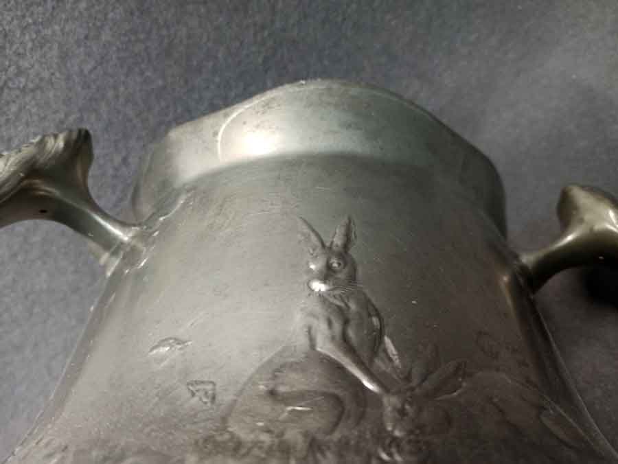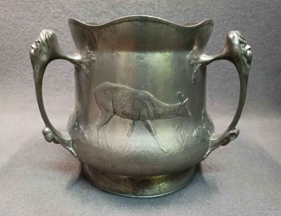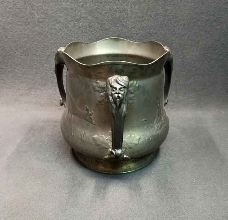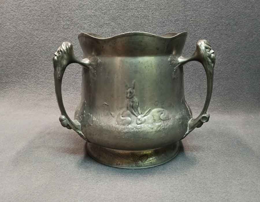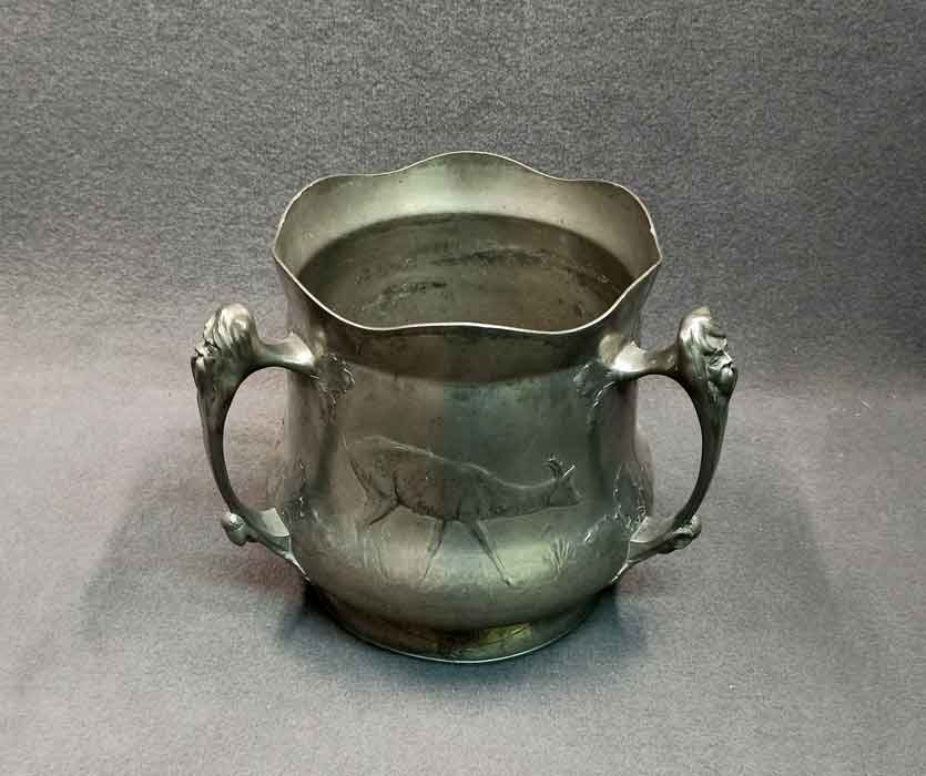 Reserviert! Kayserzinn; Weinkühler mit jagdlichen Motiven, Jugendstil um 1903, Entwurf Johann Christian Kröner. Zylindrische Form, drei plastische Henkel mit Maskarons, auf der Wandung Reliefdekore mit Rehbock, Fuchs und Hasen.