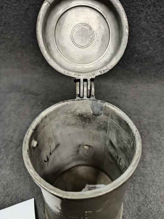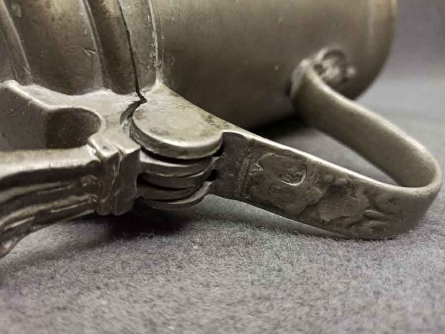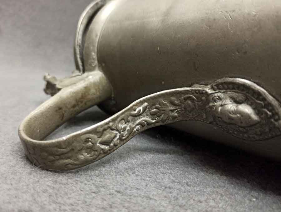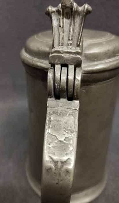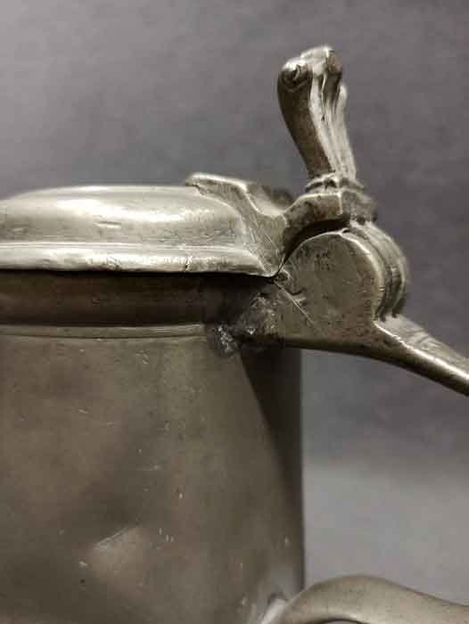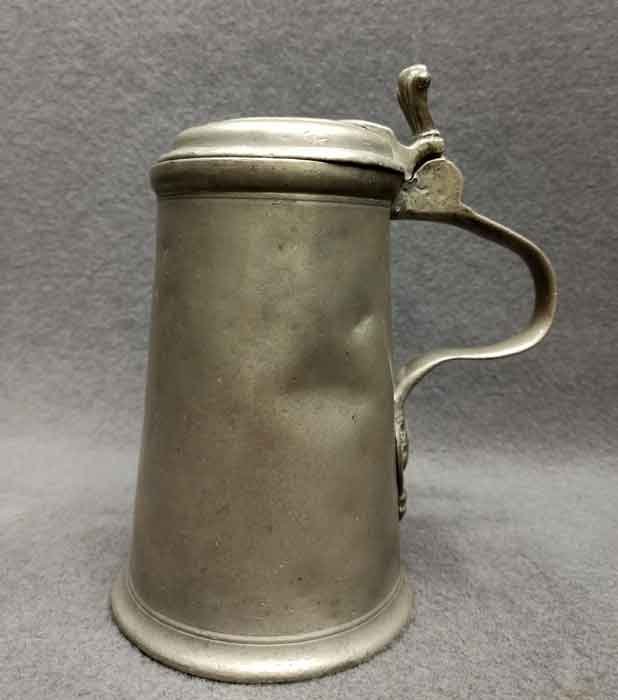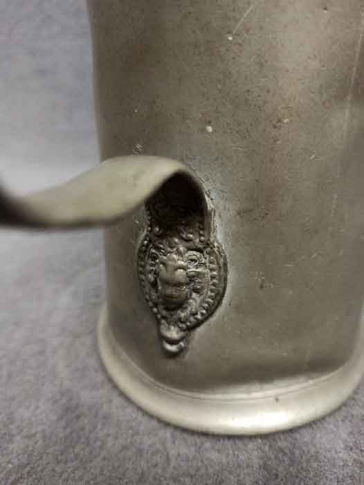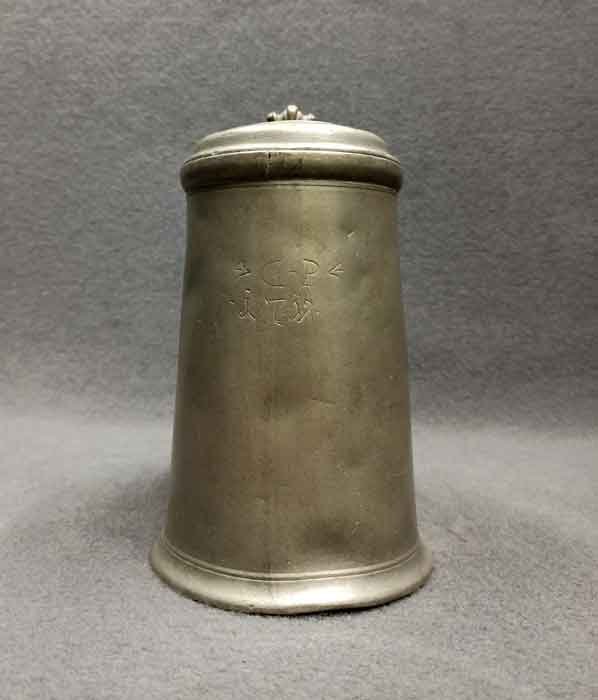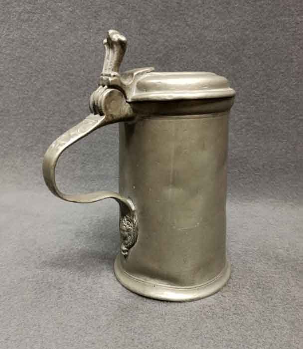 Deckelkrug, Zinn dat. 1709, Trinkkrug mit Deckel. Konische Gefäßform mit Bandhenkel. Henkel mit reliefiertem Ornament, am Ansatz aufgelegter Maskaron.  Deckel mit Federbuschdrücker. Frontseitig graviert "G.P. 1709". Innen mit Eichzapfen.