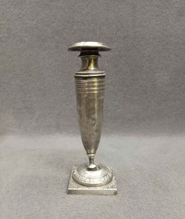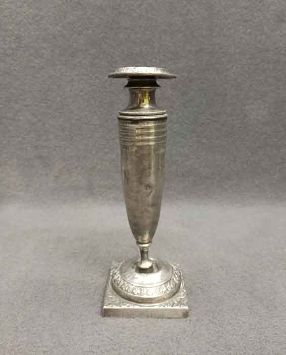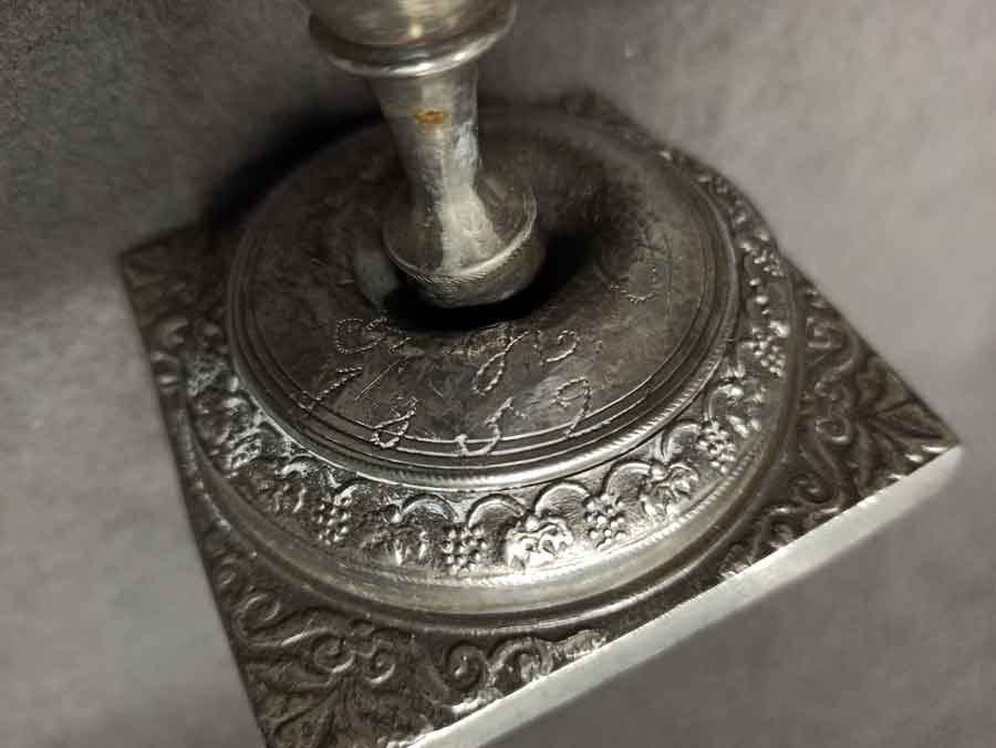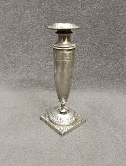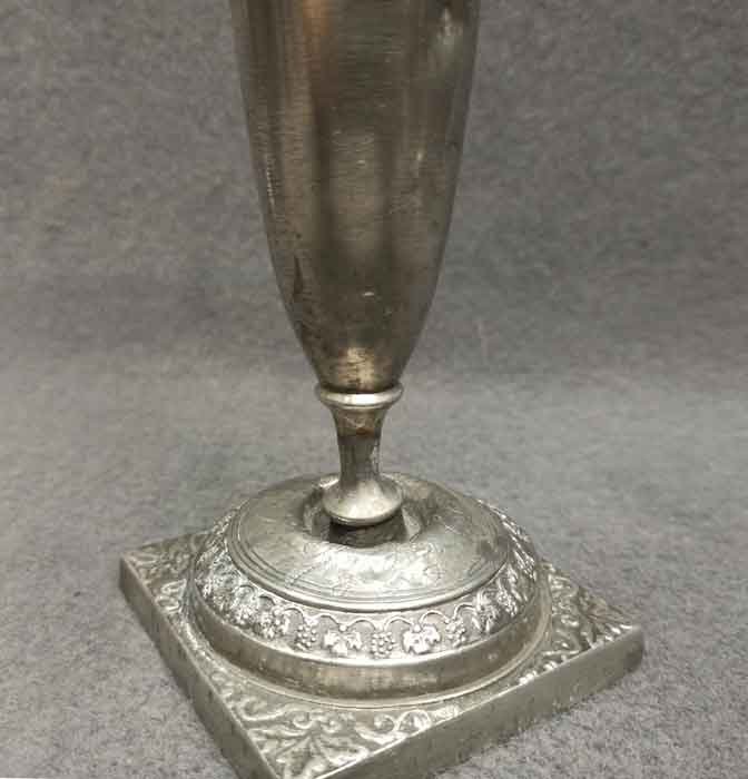 Zinn Kerzenständer 1.H.19.Jh. dat. 1852 verm. älter, nachträglich umgewidmet. Vasenförmig auf quadratischer Plinthe. Plinthe und Tülle floral (Wein- Trauben und Laub) reliefiert Auf dem Sockel mit Monogramm und datiert. Zustand mit Gebrauchspuren, kleine Dellen im Korpus, Schaft am Plinthenansatz deformiert und ausgerichtet. H. 22 cm.