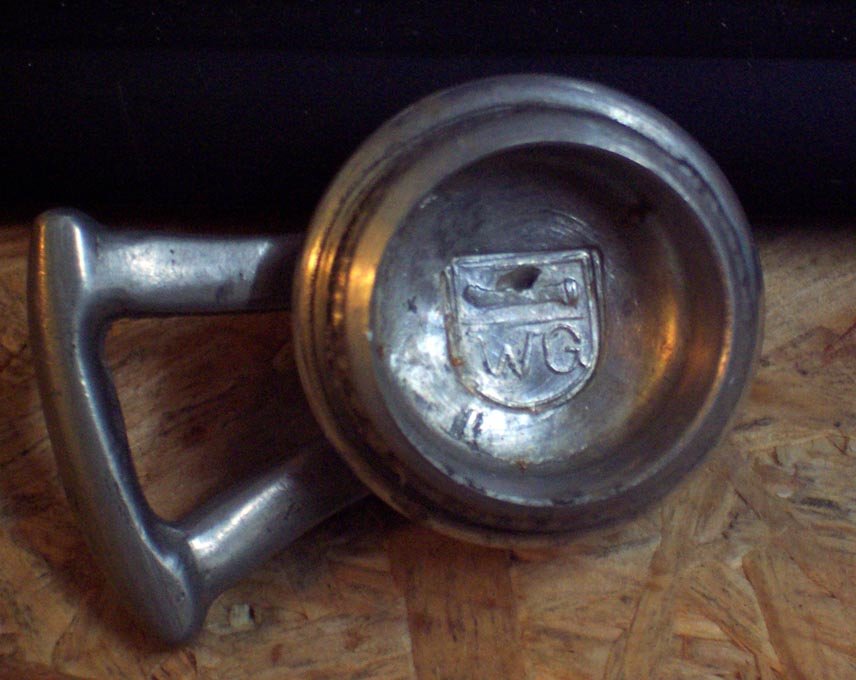 Beidseitig im oberen Bereich Punzen, Zinnmarke, Lutz Werner.Die Punze ebenfalls im Deckel innen.