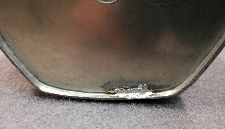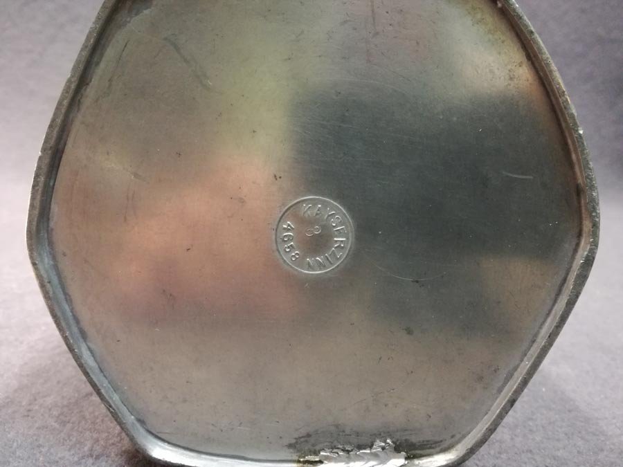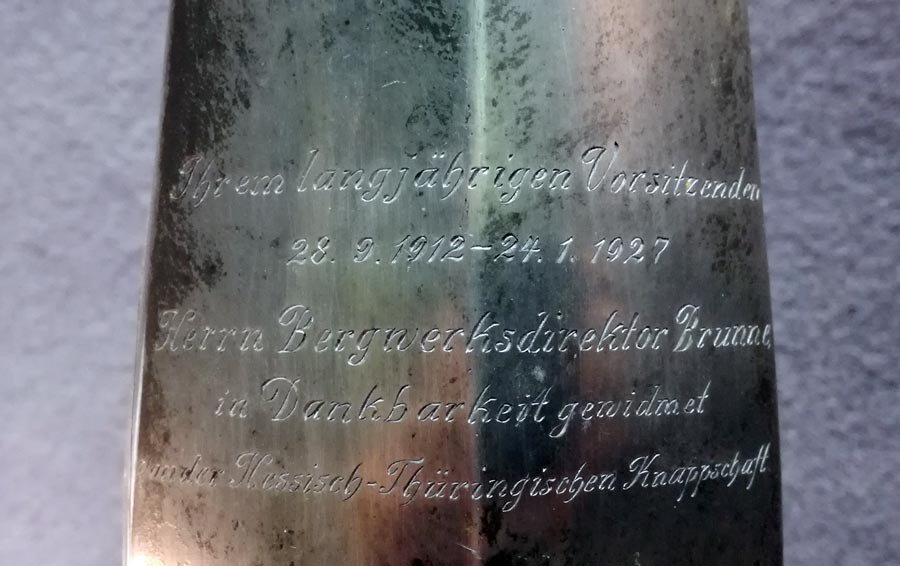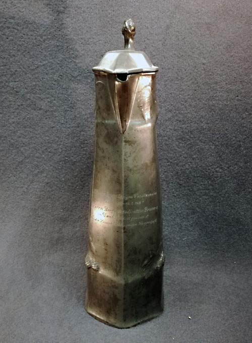 Höhe: ca. 38 cm. Guter Zustand, Ausguss etwas verdrückt, unterseitig am Boden eine nachträgliche Lötstelle. Vorderseitig alte Widmung für Bergwerksdirektor.