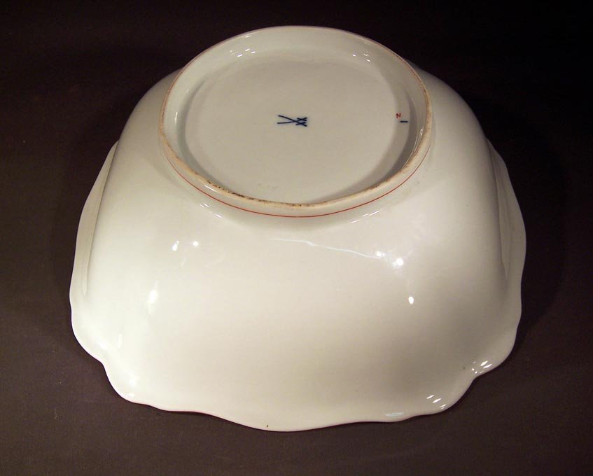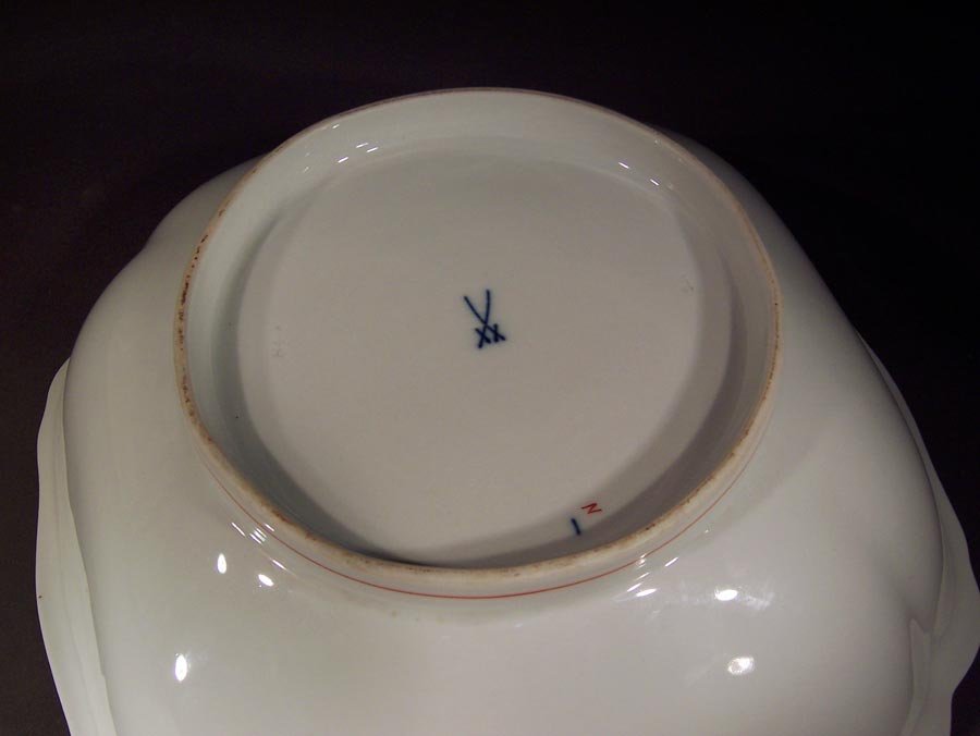 Blaue Schwertermarke mit 4 Schleifstrichen. Unbenutzter, sehr guter Zustand ohne Beschädigungen. Kleine Herstellungsbedingte Glasurunregelmäßigkeiten.