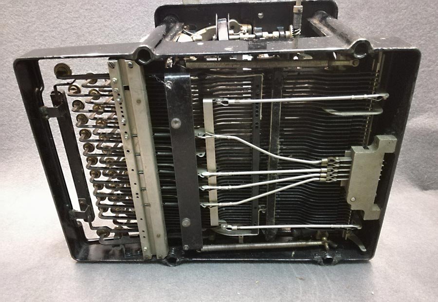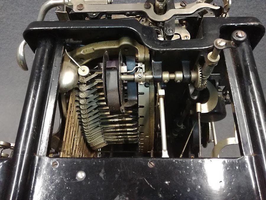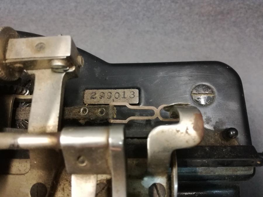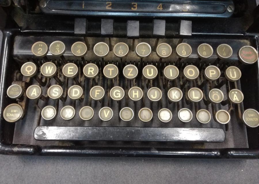Zustand gut, ungereinigter Fundzustand. Alle Tasten und Typen mit Funktion, der Schlitten rückt nach. Beschriftung der Tasten ist überall vorhanden. Einer der Gummifüße fehlt (die anderen liegen dabei, nicht auf den Fotos zu sehen).