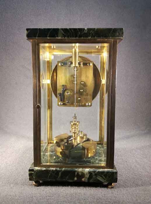 Drehpendeluhr, Jahresuhr. Basis und Abdeckung in Serpentin. Vierseitig verglast, facettiertes Glas in Messingfassung. Vorder- und Rückseite zu öffnen.