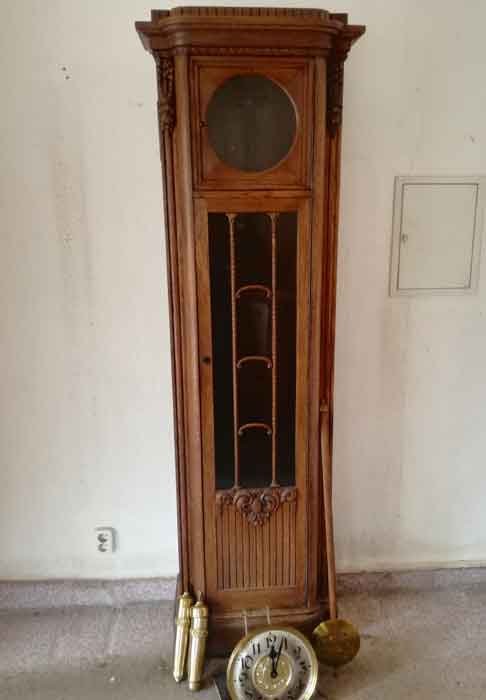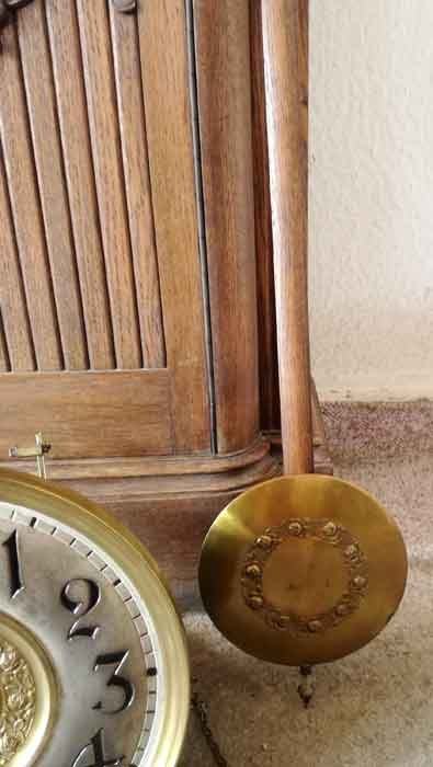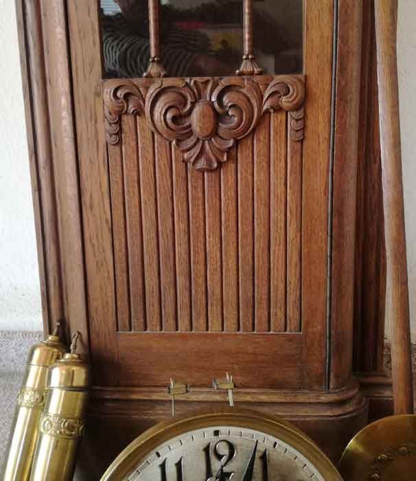 Standuhr um 1910. Seltene Gehäuseausführung. Schöner Doppelschlag. Die Uhr (Gehäuse) ist sehr gut erhalten und vollständig. Das Uhrwerk läuft und schlägt. Es gibt, trotz Funktionstüchtigkeit, kleine Mängel an der Mechanik und sollte überholt werden.