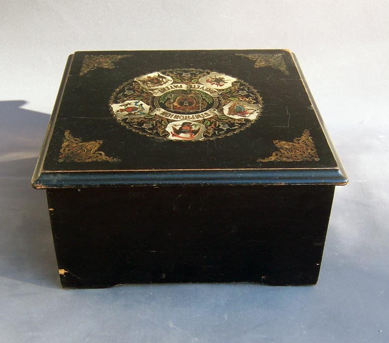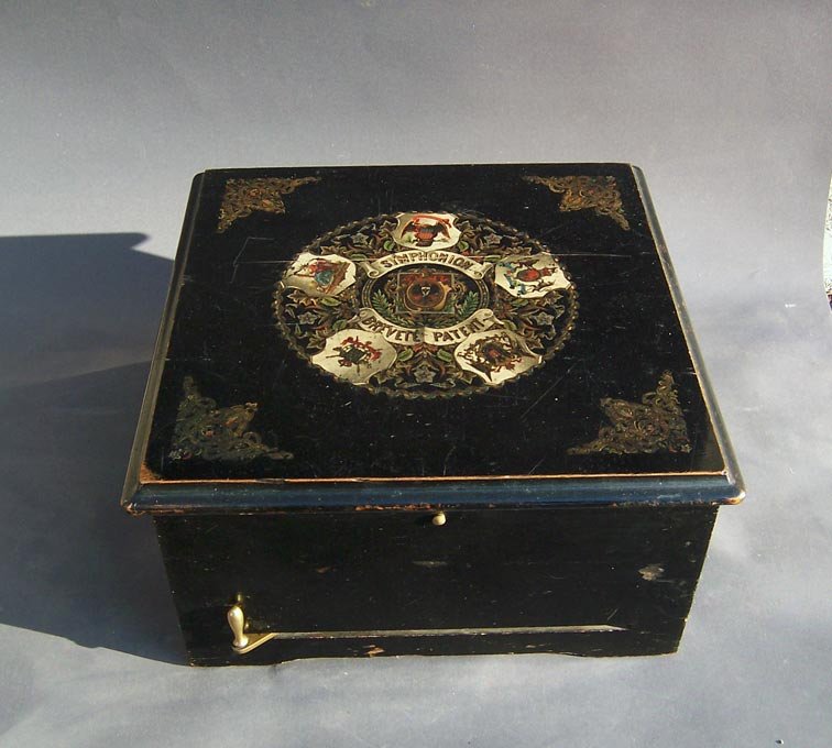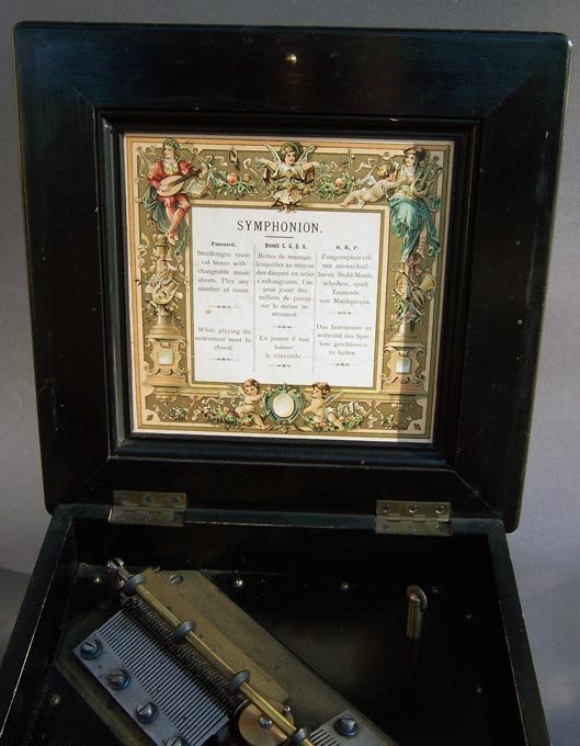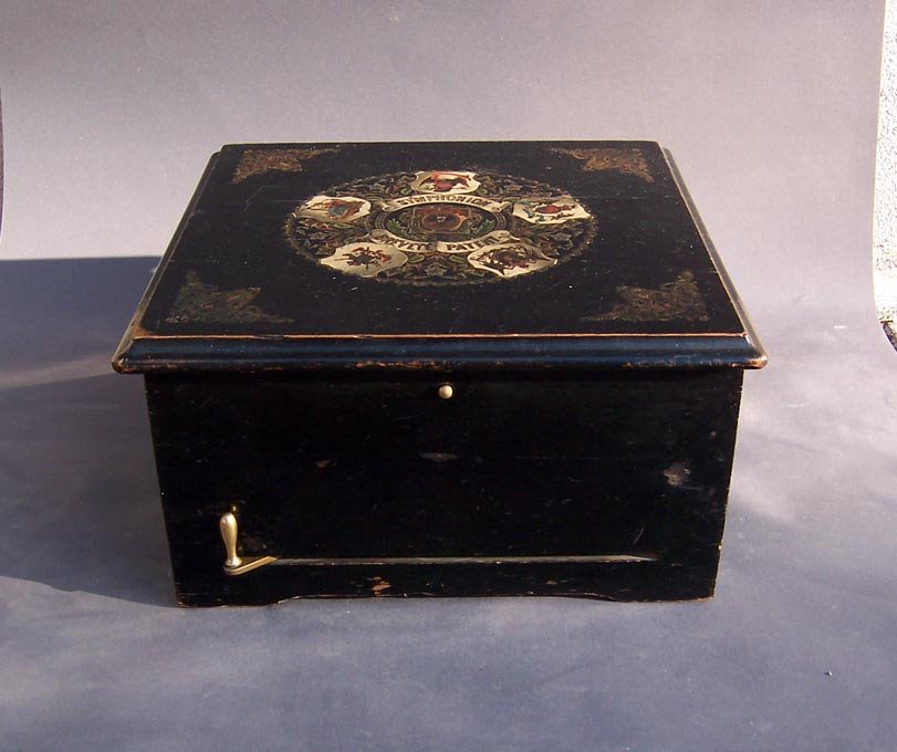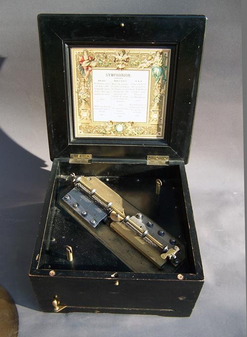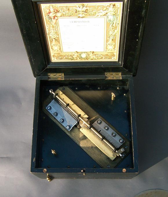 Symphonion, Spieluhr f.Blechplatten. dazu 39 orig. Platten. Originalbezeichnung im Gehäuse: "Zungenspielwerk mit auswechselbaren Stahlmusikscheiben".