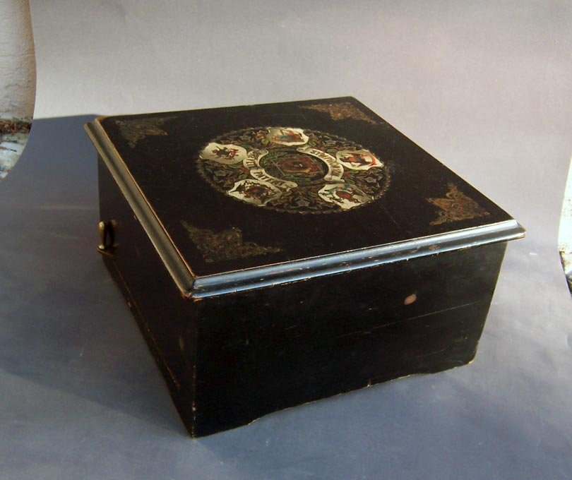 Spieluhr mit Doppelkamm, um 1880. Für Blechplatten mit Durchmesser 27 cm. Dazu 39 originale Blechplatten in sehr gutem Zustand, darunter 3 Weihnachtslieder; "Stille Nacht,heilige.."; "Oh Du fröhliche..."; "Oh Tannenbaum"