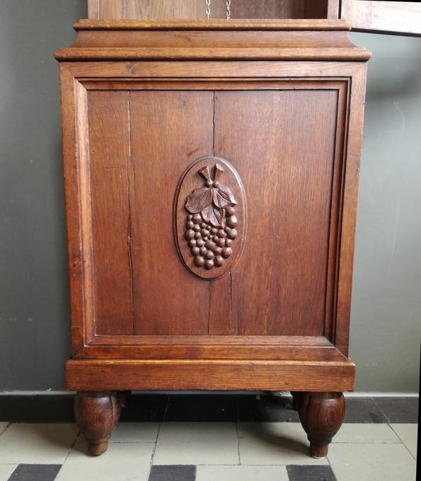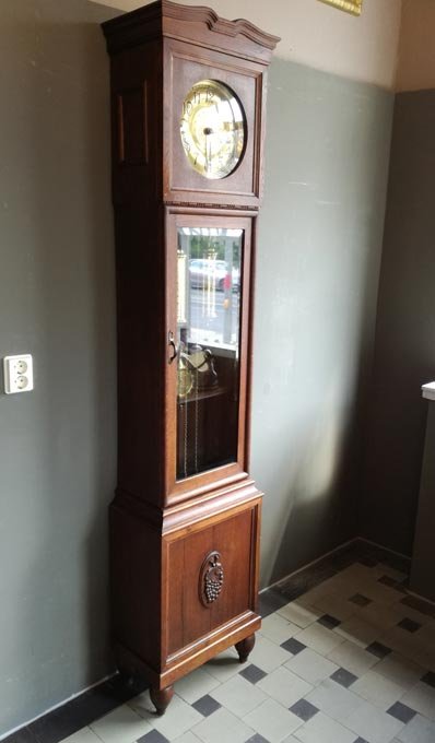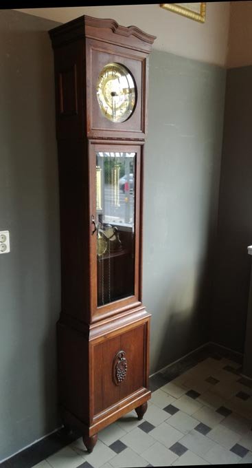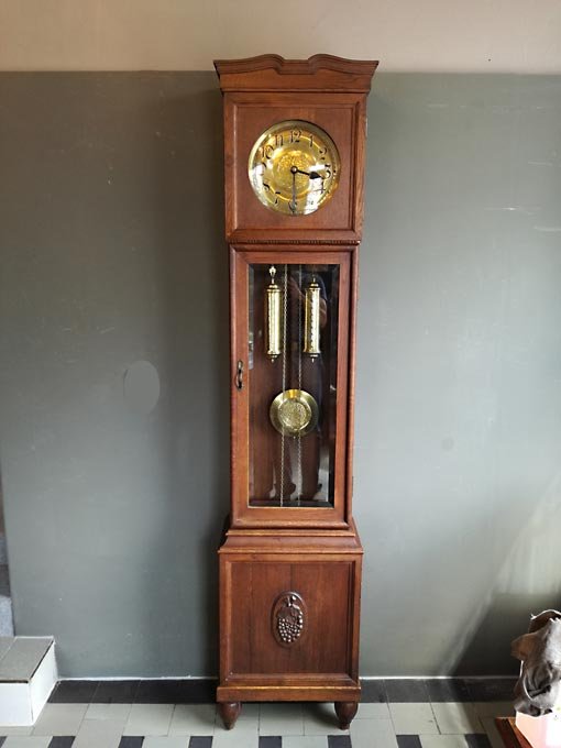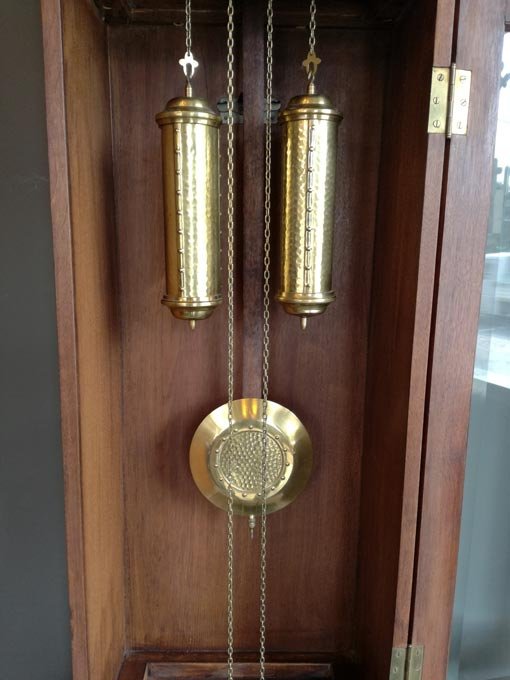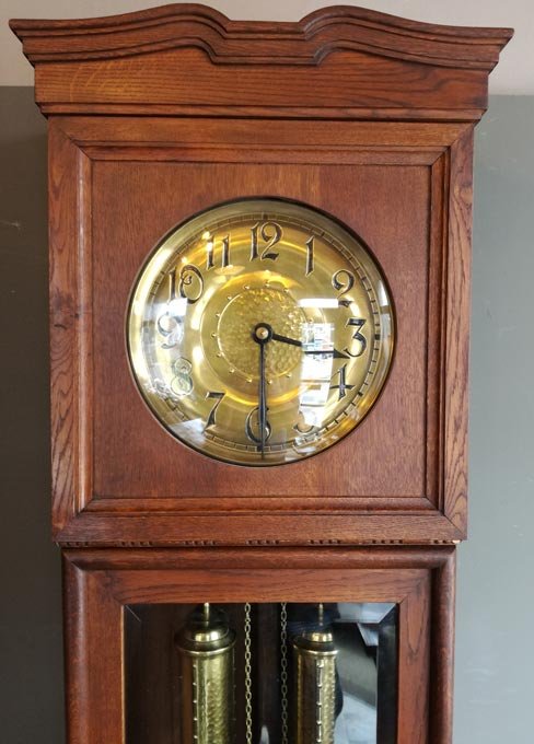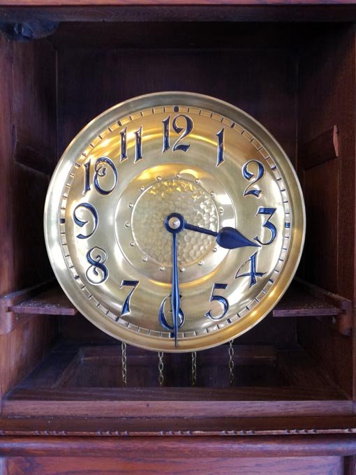 Standuhr um 1910, Gehäuse: helle Eiche, Uhrwerk: Friedrich Mauthe, Schwenningen im Schwarzwald.