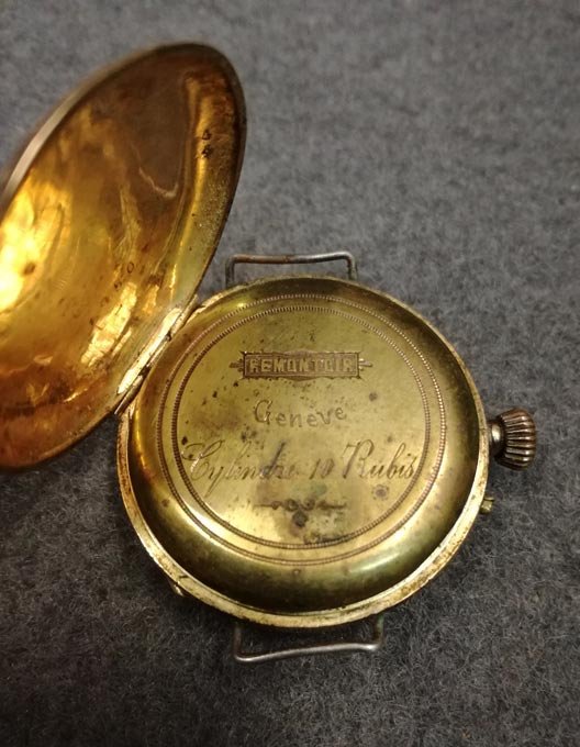 Gehäuse Gold, gestempelt K 14 (14 Karat also 585 er Gold). Der innere Deckel Metall, bezeichnet mit: Remontoire - Geneve - Cylindre 10 Rubis