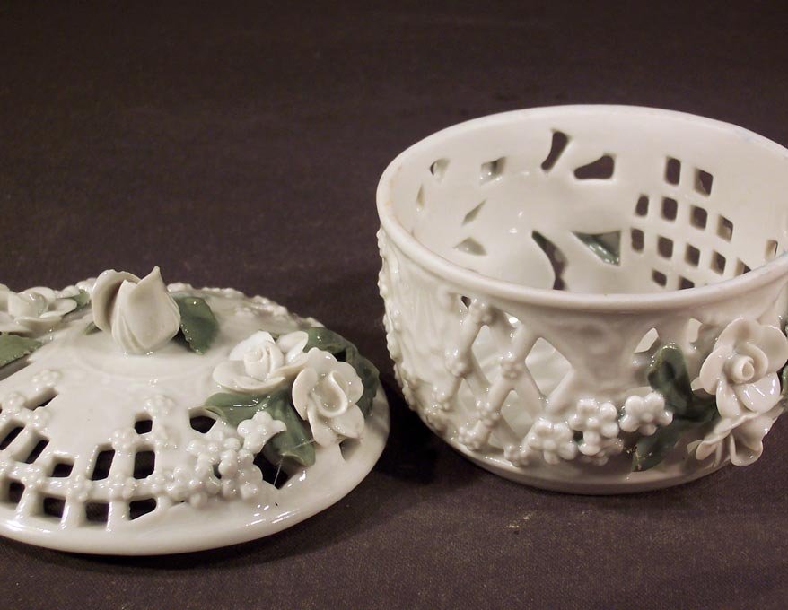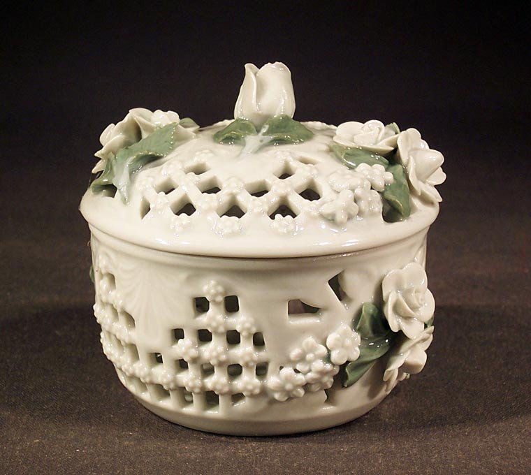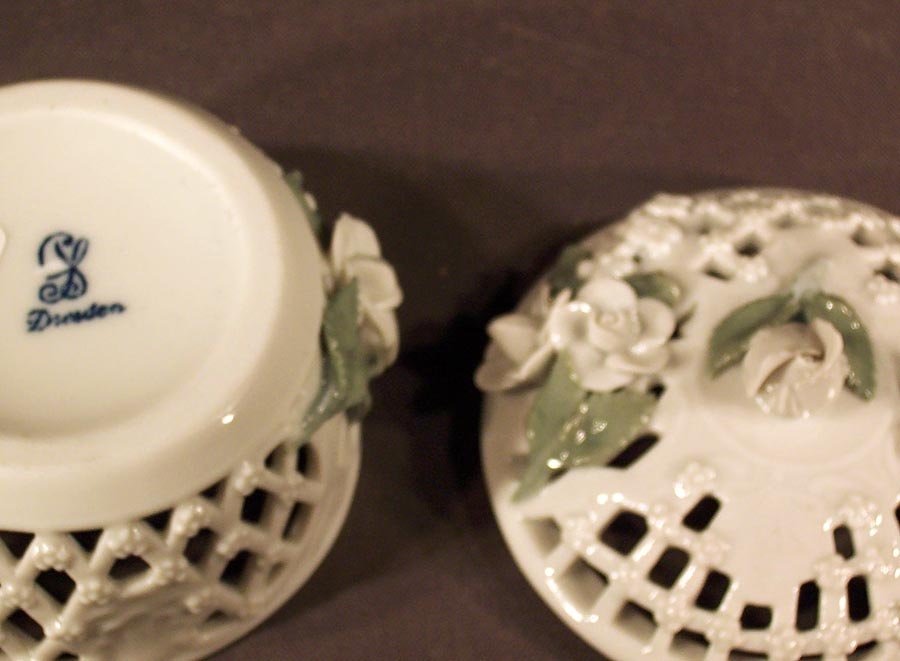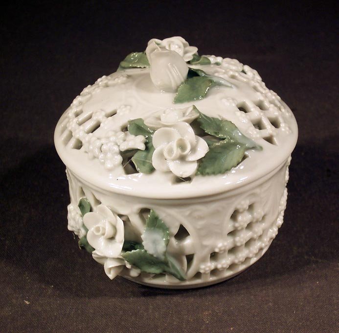 Zierliche Gitterdose mit durchbrochenem Gitterrand, Blütenbesatz sowie dezent grüne Staffage.