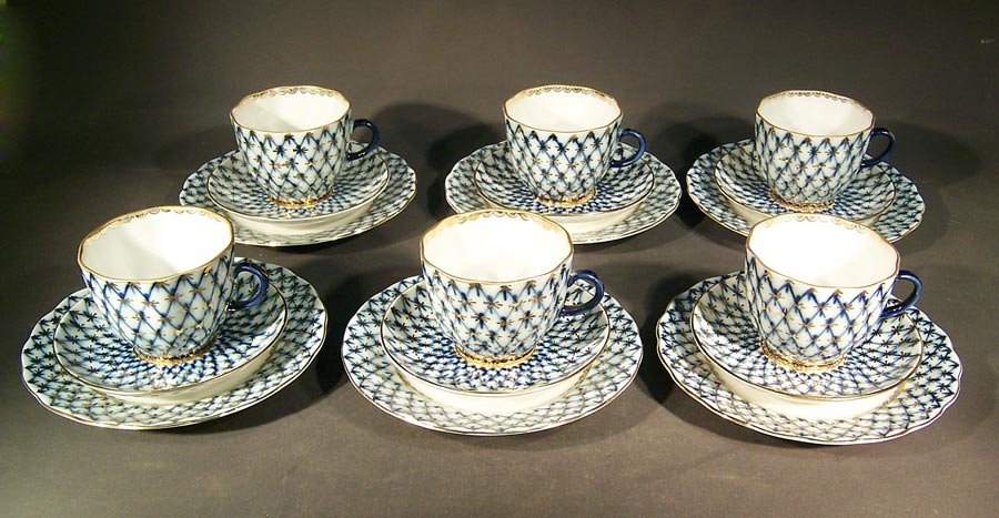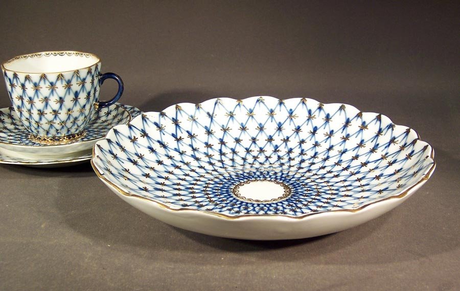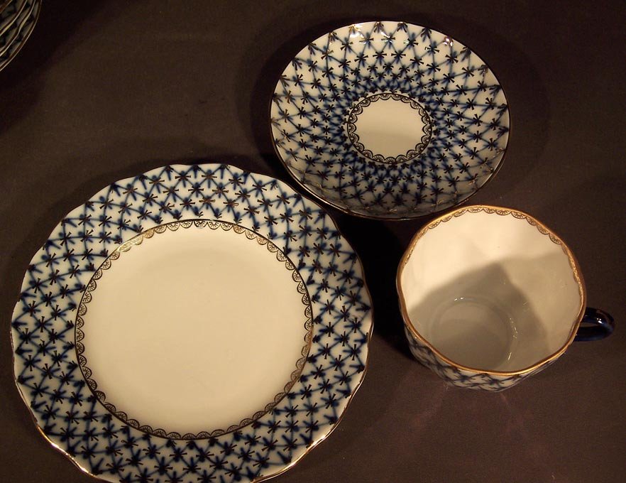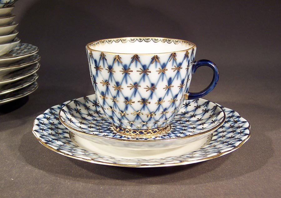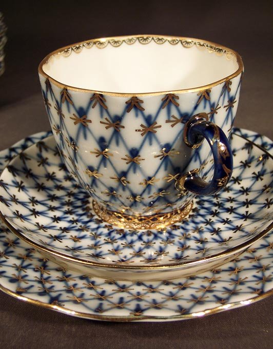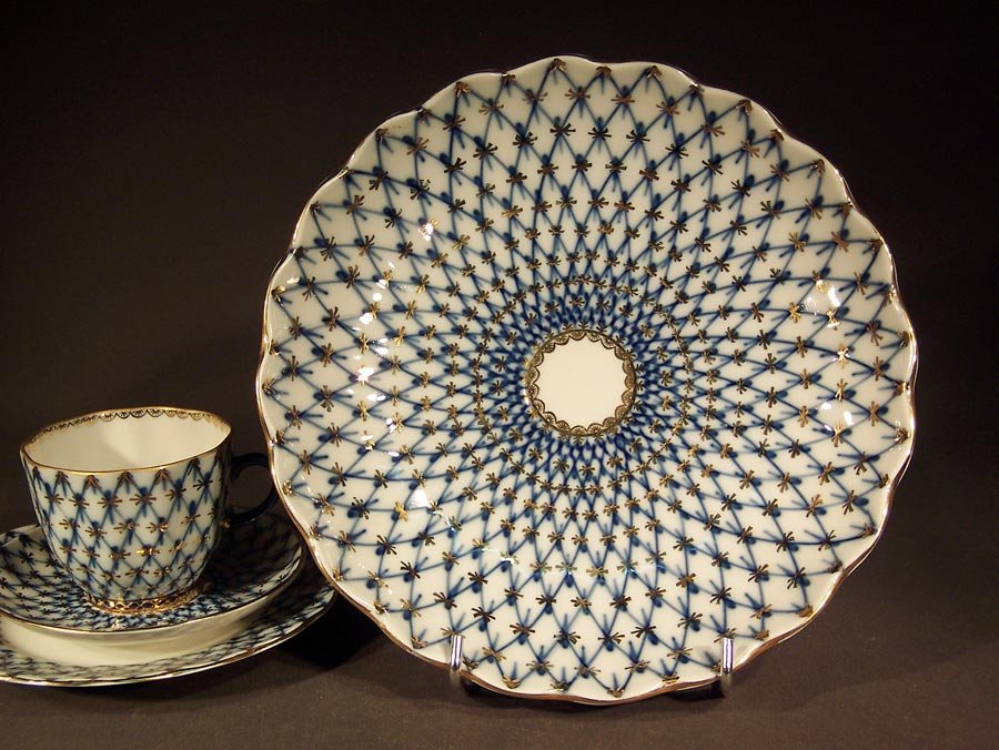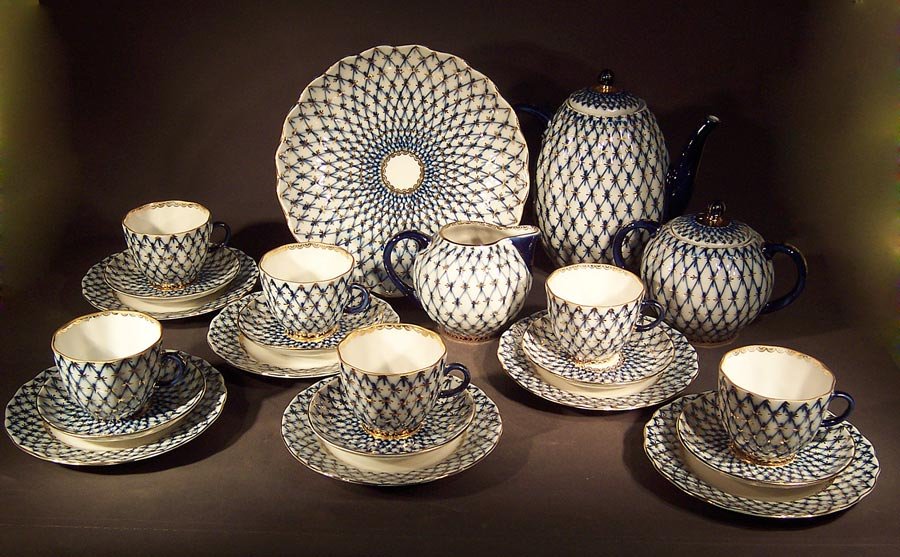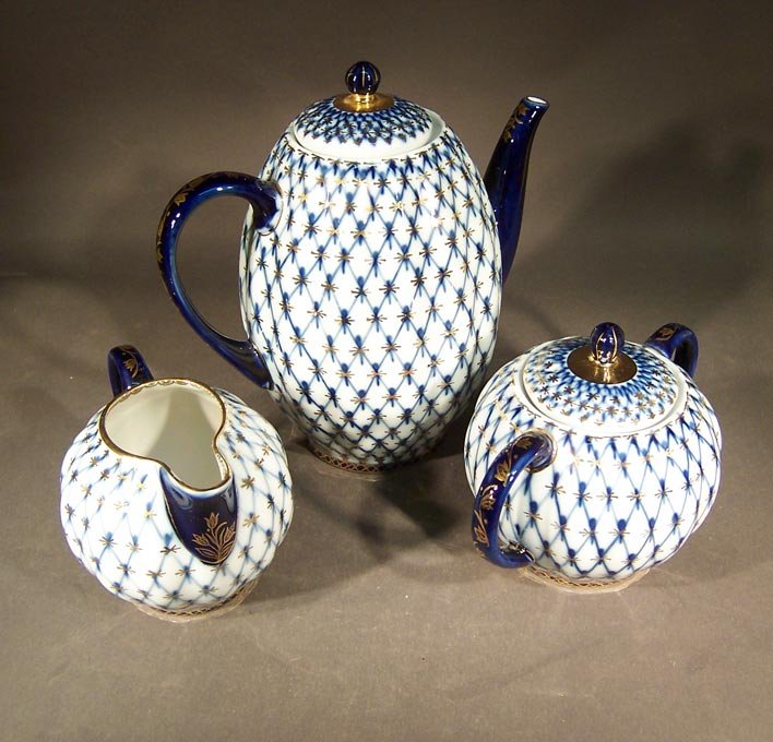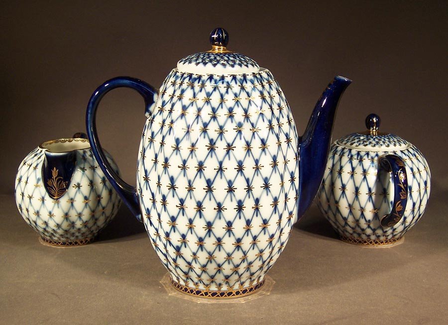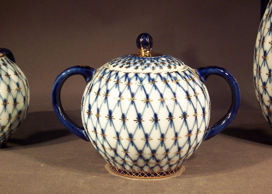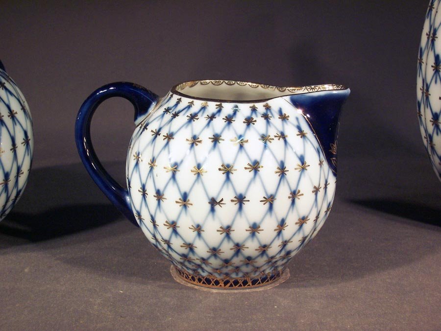 Kobaltnetz mit Gold. Henkel, Knauf, Ausguss und Standring aller Teile in Kobaltblau mit Goldornament. Die Ränder mit feinem Golddekor.