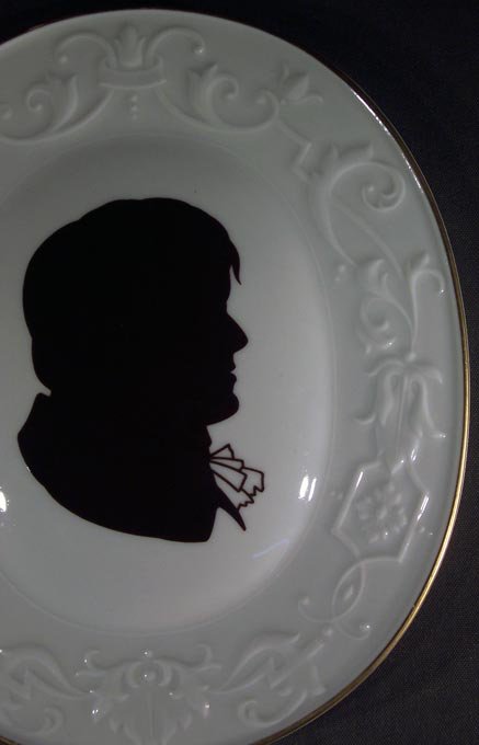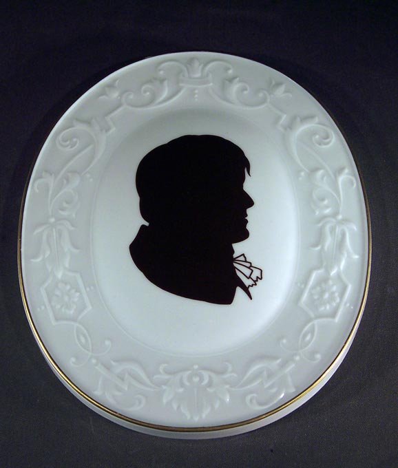 Ovale Plakette mit Reliefrand, auf dem gewolbten Mitteloval ein Profilbild in der Art eines Scherenschnittes. Die äußere Kante vergoldet.