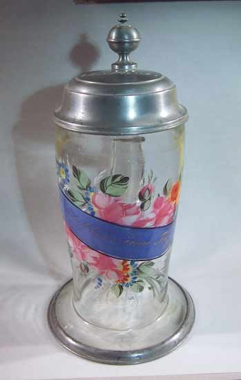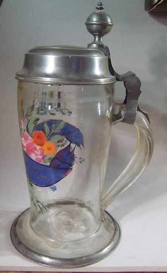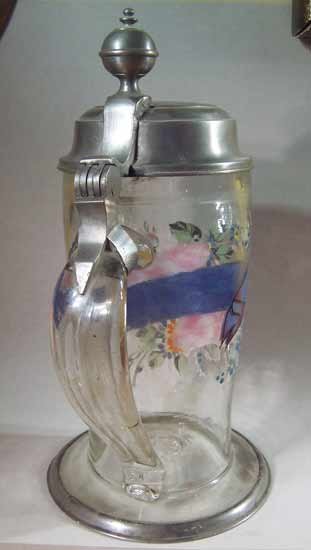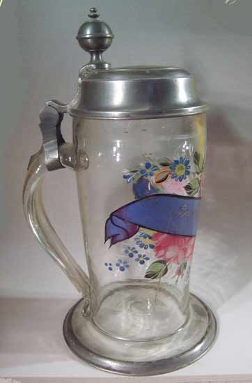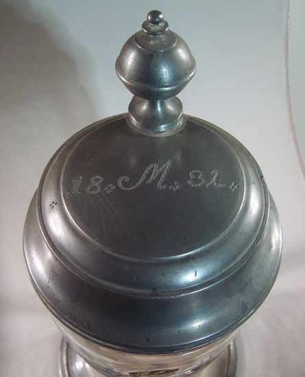 Glaskrug, Abrissglas mit Zinndeckel und Standring aus Zinn (original, nicht ergänzt).