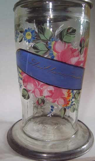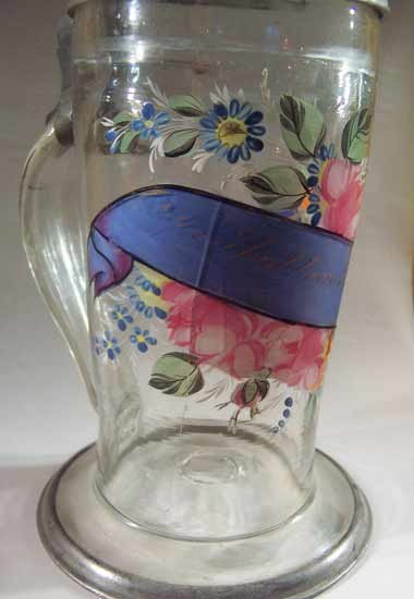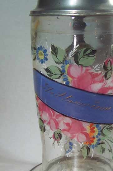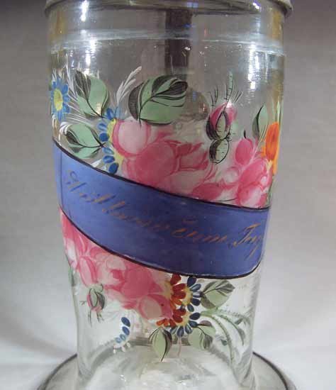 Auf der Wandung die typische Blütenmalerei in Emaille mit blauem Spruchband und goldener Schrift:
