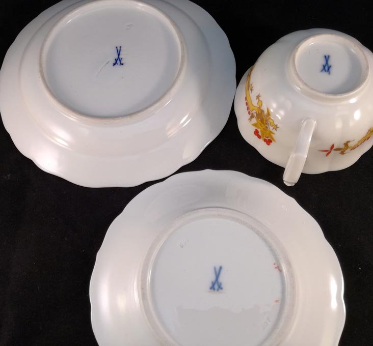 Manufaktur Meissen Blaue Schwertermarke, Tasse 1.Wahl ohne Schleifstriche, Untertasse 1 x neben den Schwertern geritzt, Kuchenteller 4 mal geritzt. Tasse ohne Gold, beide Teller mit Gold, Kuchenteller farbig-, Unterteller goldgeschuppter Drache.