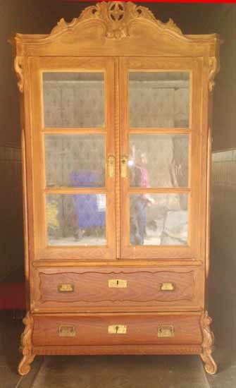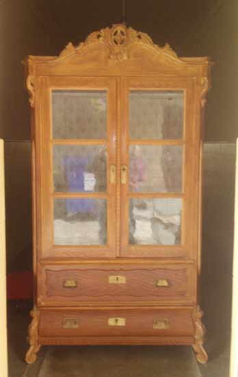 Zweitürig, darunter 2 Schubkästen. Aufwänig gearbeitete, zeittypische Verzierungen.