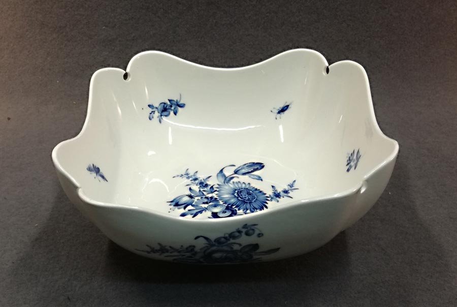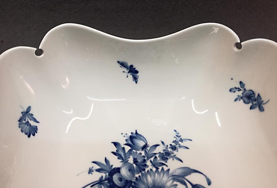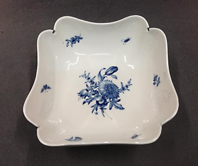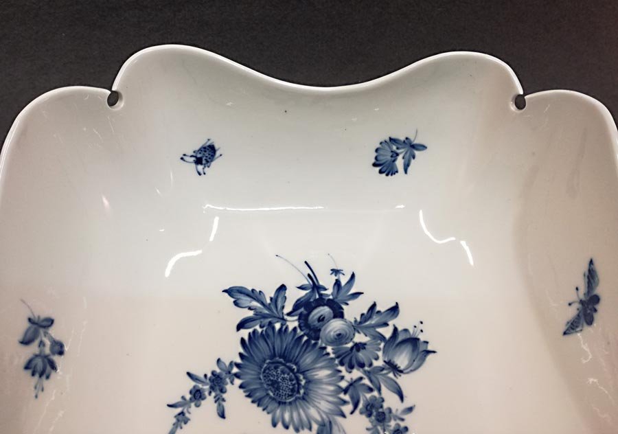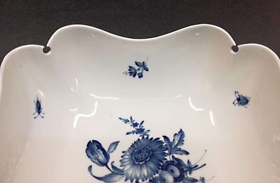 Große Viereckschale mit geschwungenem Rand. Malerei mit Insekten und Blumen in Blau.