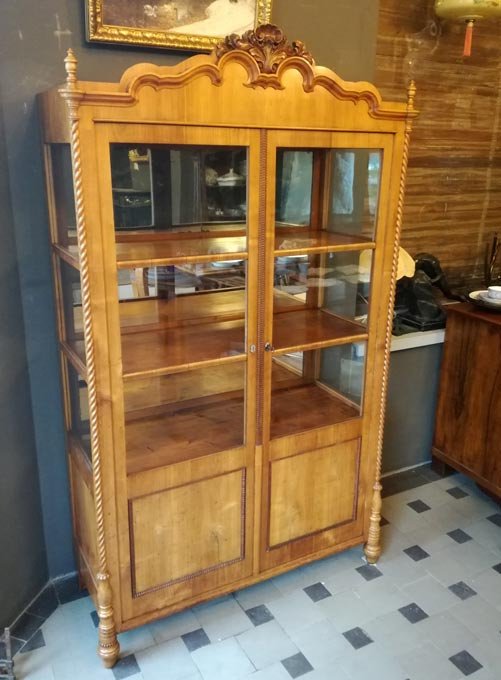 Vitrine, Spätbiedermeier um 1840, Kirsche furniert. Dreiseitig verglast, Rückseite verspiegelt.