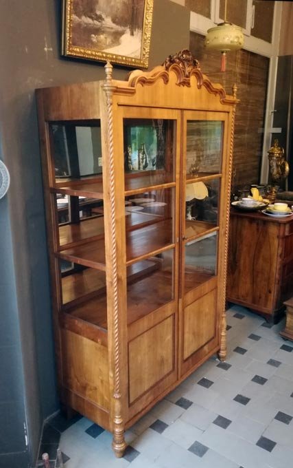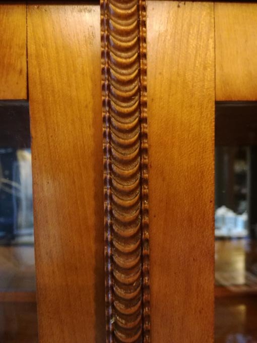 Weitgehender Originalzustand, Beschläge, Schlüssel, Schloss, Verglasung etc. aus der Zeit, Korpus vollständig original. Sehr guter Zustand, Oberfläche sanft überarbeitet. Ein Beschlag leicht beschädigt.
