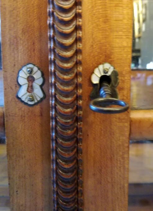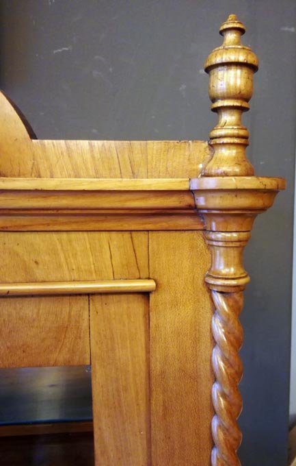 Ecken mit gedrehten Säulen, geschwungener Giebel mit Zentralschnitzerei, kassettierte Türfüllungen mit Flammleisen und geflammte bzw. geschuppte Schlagleiste.