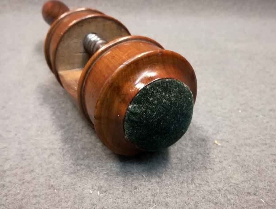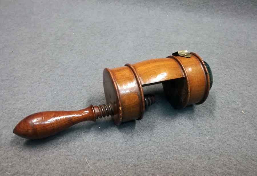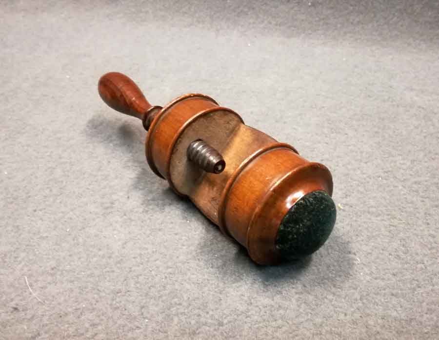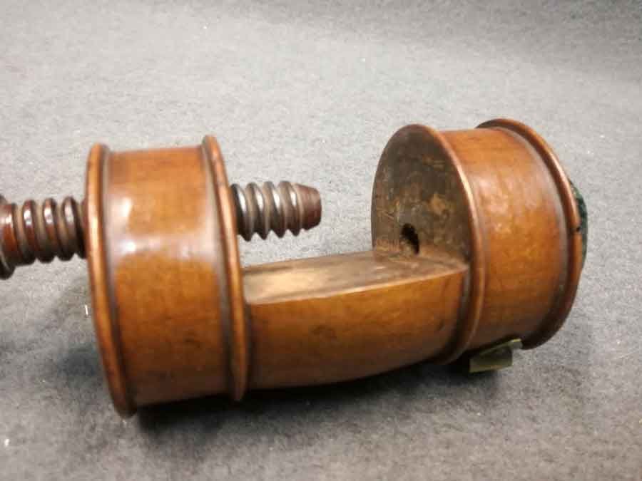 Biedermeier Nähzwinge mit Nadelkissen um 1825. Kirschholz. Sehr guter Zustand- Rückseitig mit Halterung für Zubehör. L. ca 17 cm mit eingedrehter Spindel, D. ca 6 cm