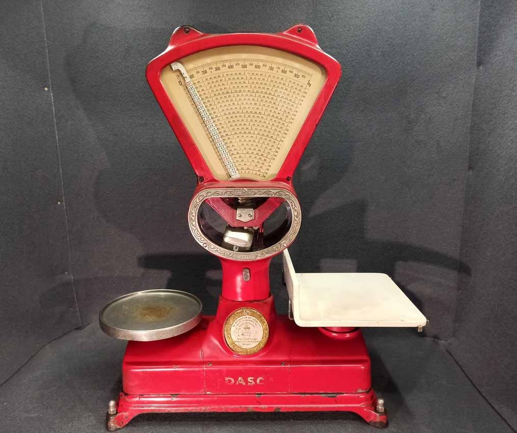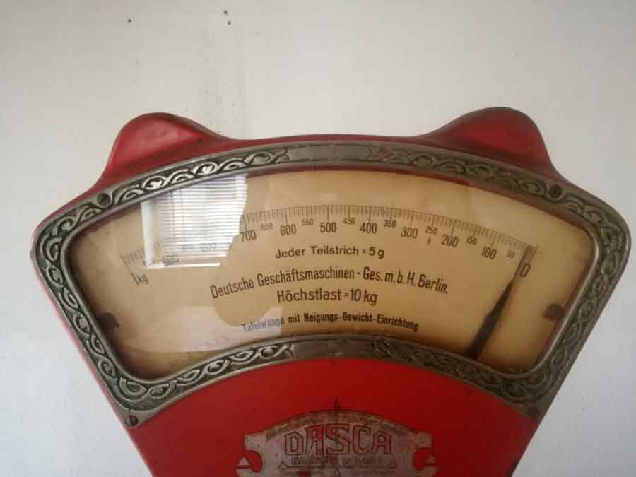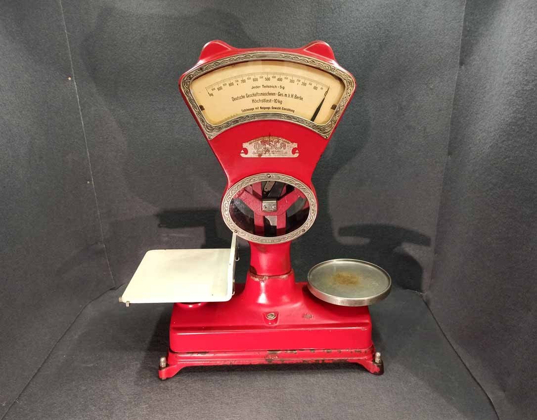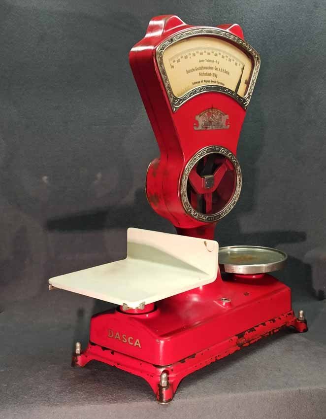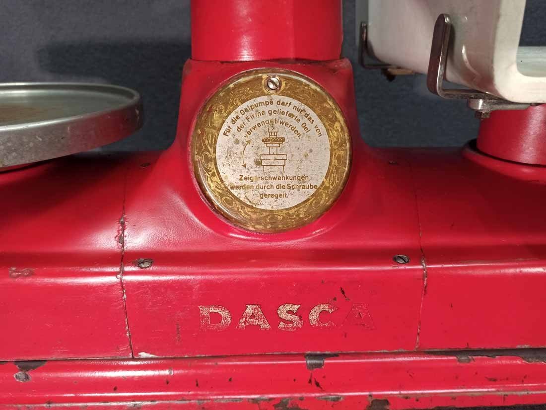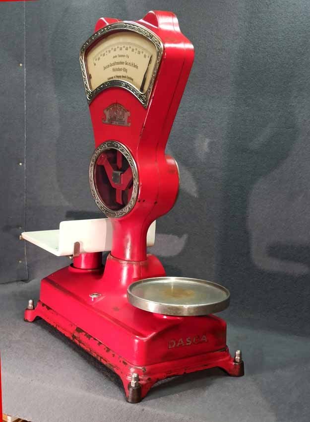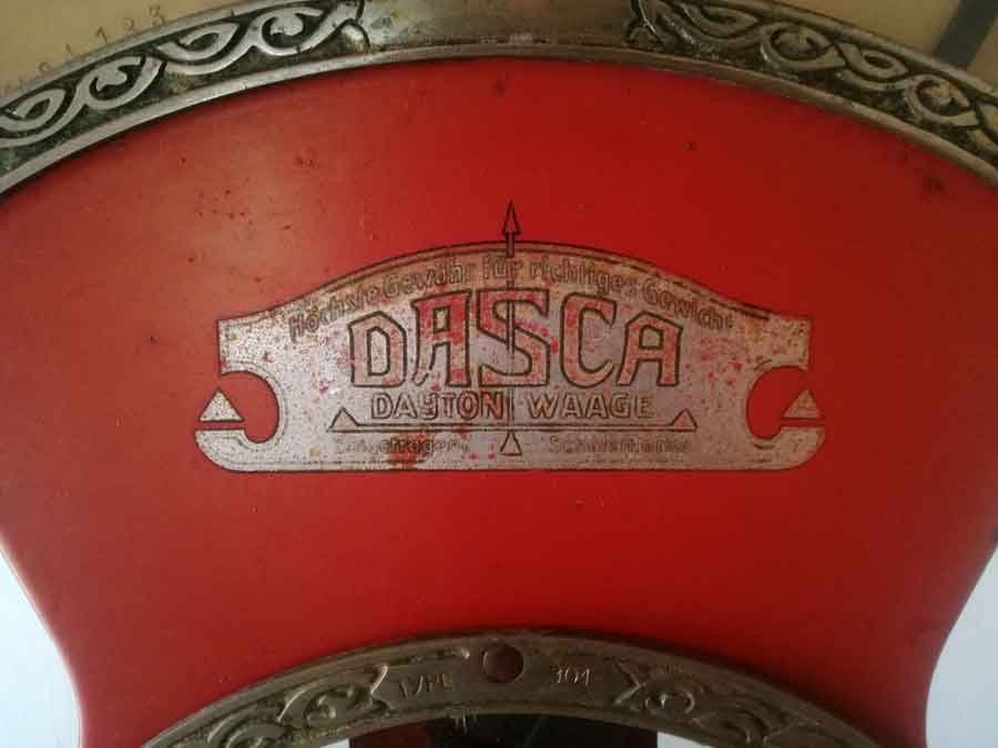 DASCA Dayton Waage, Type 301, No.24183,  1920er Jahre. Original, vollständig und funktionstüchtig. DEGEMA - Deutsche Geschäftsmaschinen Gesellschaft m.b.H. Berlin. Dayton amerikanische Firma der 1920/40er Jahre, deren Geräte durch die DASCA-Gesellschaft in Europa importiert wurden. Aufgrund der hohen Kosten wurden hier nur wenige Exemplare verkauft. Zustand siehe Fotos, gereinigter Fundzustand. Technisch funktionstüchtig und vollständig. Außen mit Lackabplatzungen,- abrieb. Den optischen Zustand würde ich Shabby Chic benennen, dekorativ-authentisch.