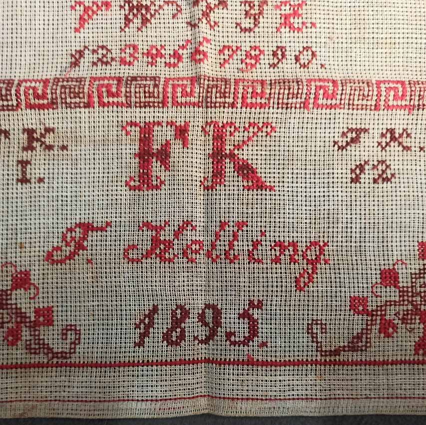 Stickmustertuch, ABC Tuch, 1895, F. Kelling. 30 x 30 cm