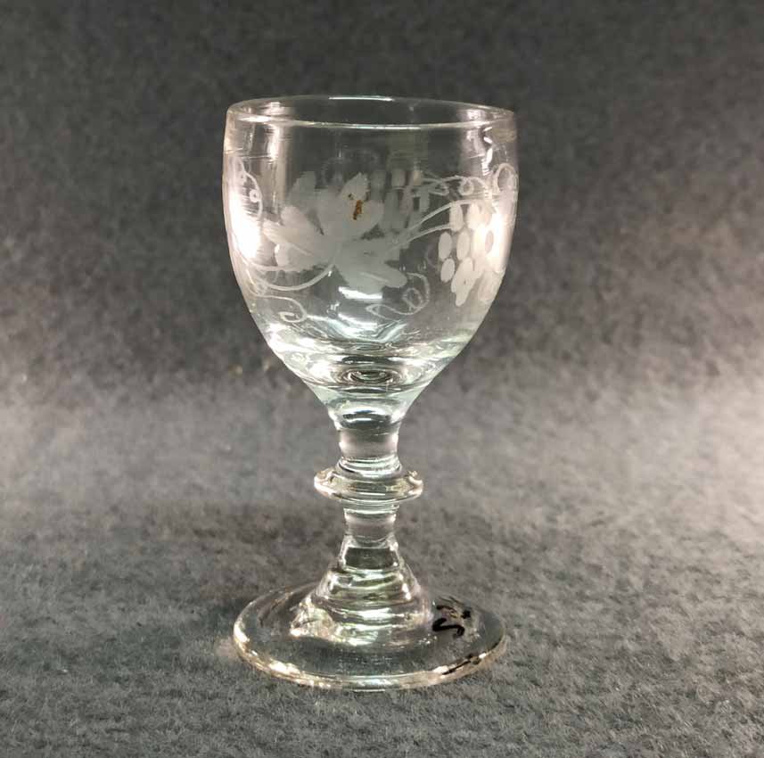 Schnapsglas, Biedermeier Abrissglas 2.Vietel 19. Jh. Graviert mit Weinlaub und Trauben. Sehr gute Erhaltung ohne Beschädigungen. H. 8,5 cm, D. 4,3 cm.