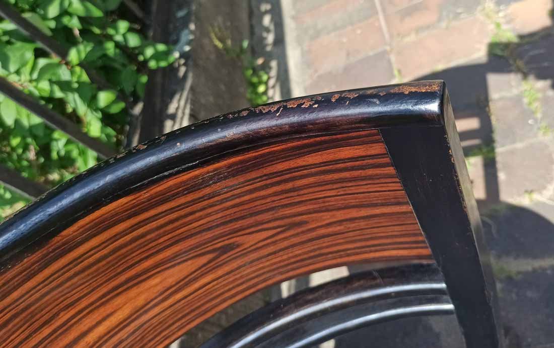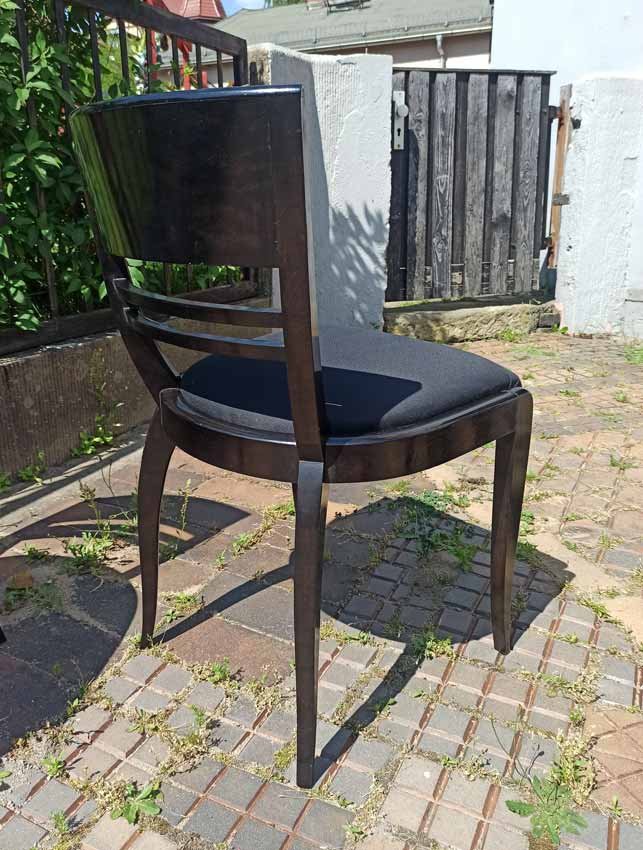4x Stühle ca 1925, Art Deco, Frankreich. Schwarze Stühle die Rückenlehne Palisander furniert. VGuter Zustand, sofort nutzbar, die Polster i.O. und straff und sauber, normale Nutzungs- und Gebrauchsspuren. H. 49/80 cm, B. 47 cm