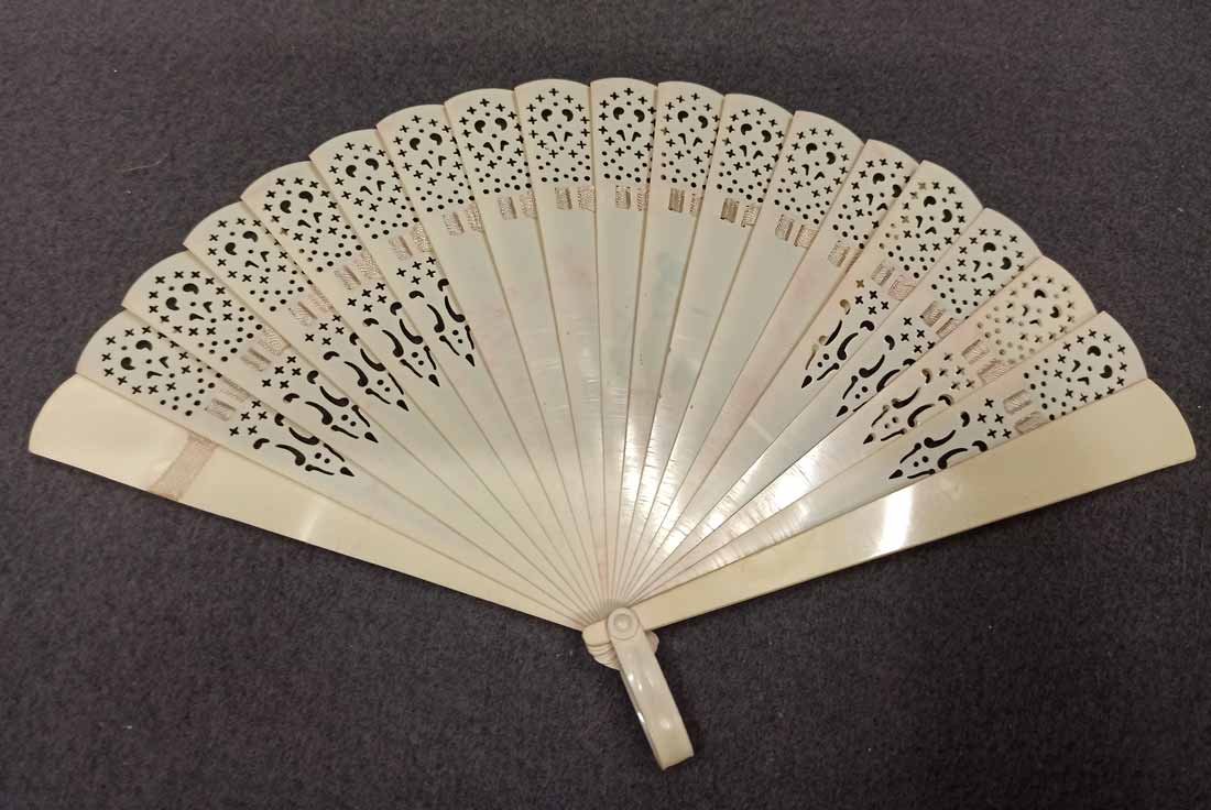 Fächer um 1900 aus Elfenbein-farbigen Zelluloid mit Darstellung und Verzierungen. H.14 cm, B. offen 25 cm.