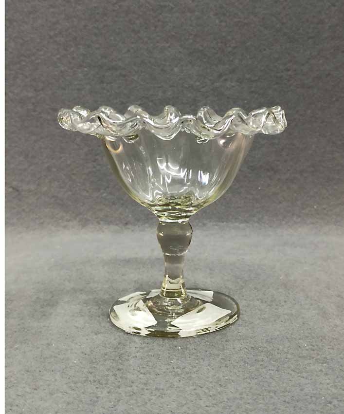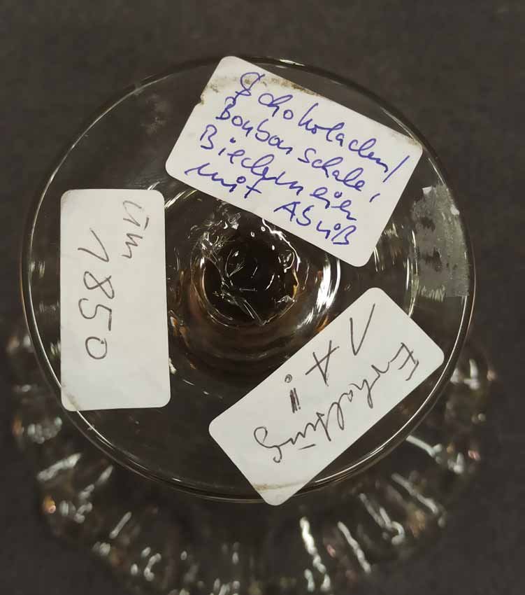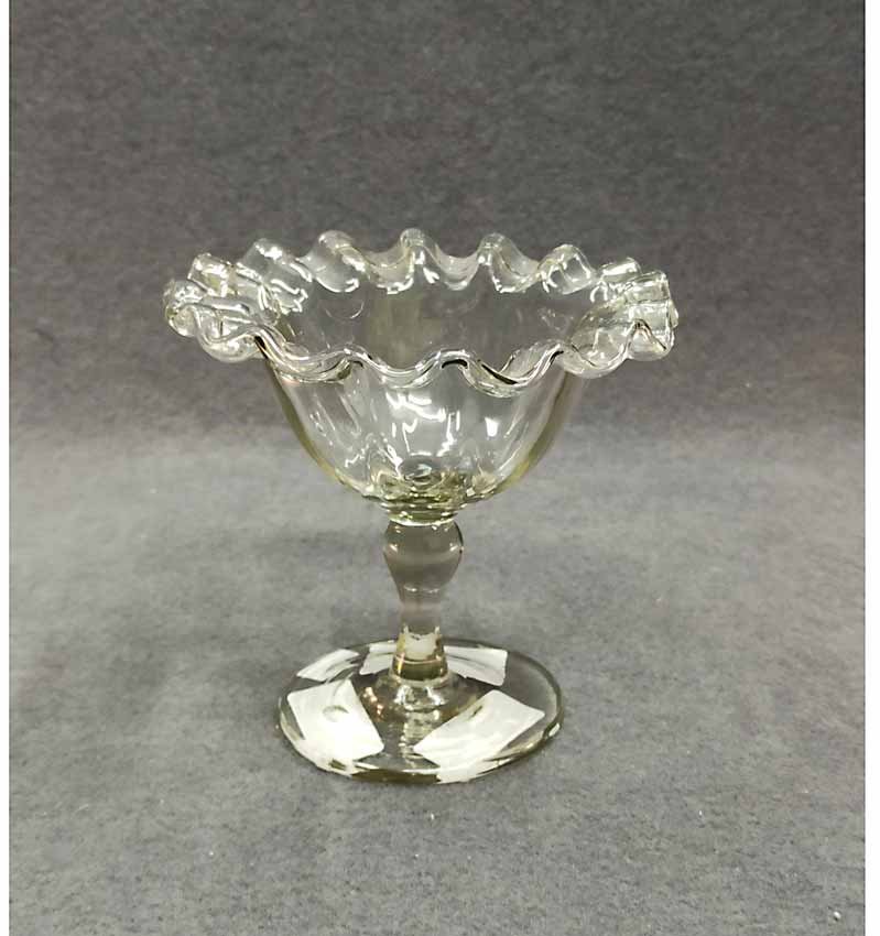 Fußschale, Biedermeier 1.Häfte 19. Jh. Farbloses Glas, gewellter Rand, Abriss am Boden. Sehr gut erhalten ohne Beschädigungen. Am Boden alte Sammleretiketten mit Beschr. H. 12,5 cm, D. 13 cm.