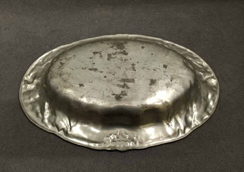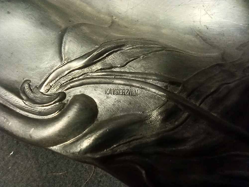Kayserzinn um 1895, große Schale Jugendstil Dekor floral; stark relefierte Blüten und Blätter. Auf der Fahne gemarkt mit Schriftzug "KAYSERZINN" geprägt. Guter Zustand mit geringen Nutzungsspuren. Mit Monogr. S.H. L. 44 cm, B. 30,5 cm, H. 5,5 cm.