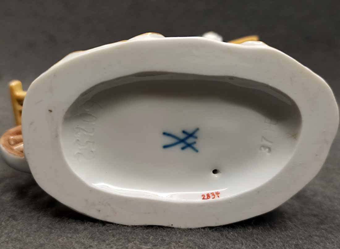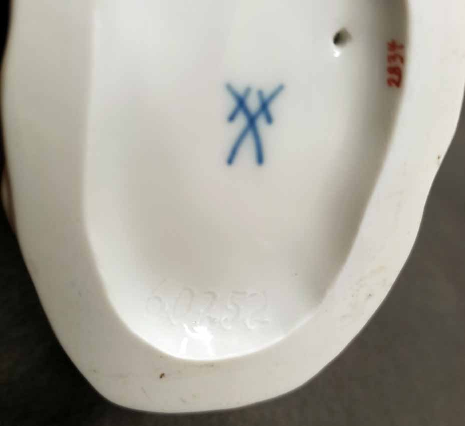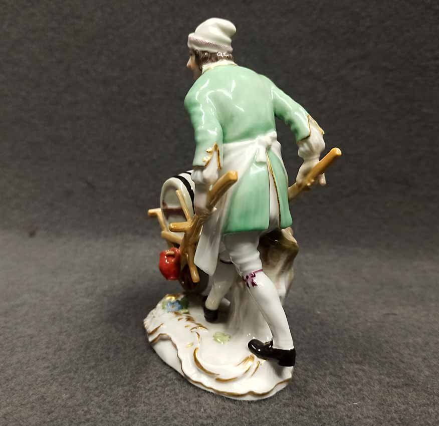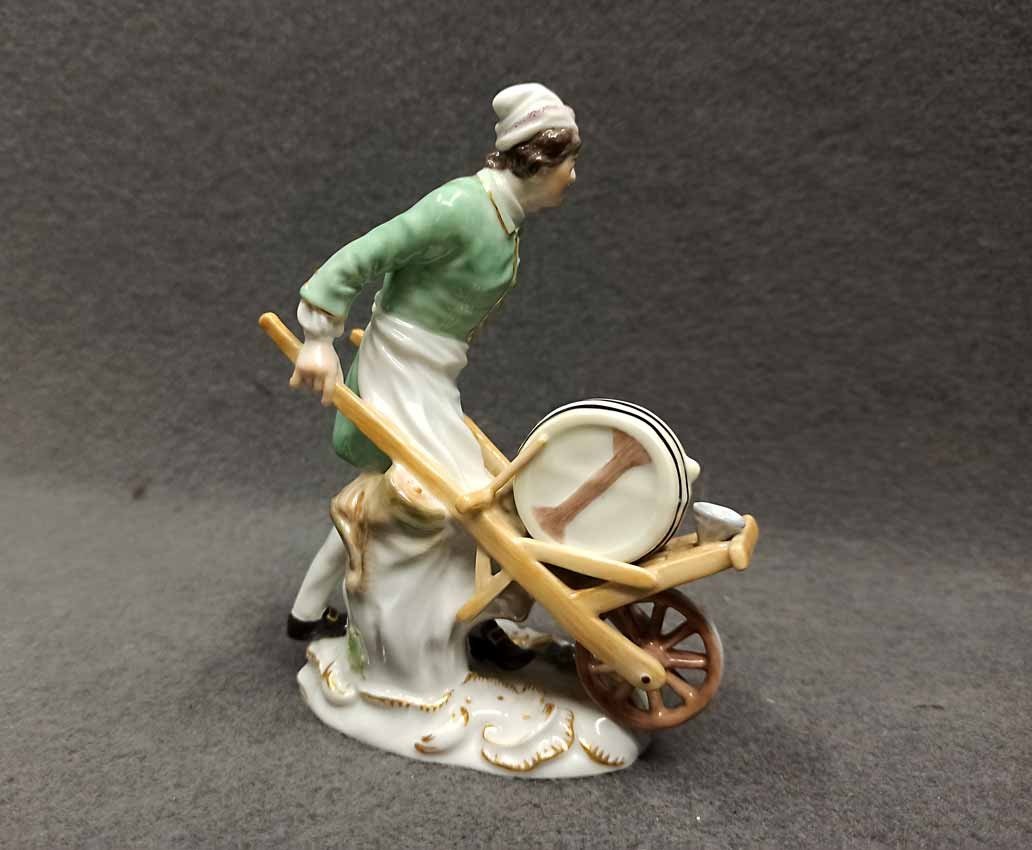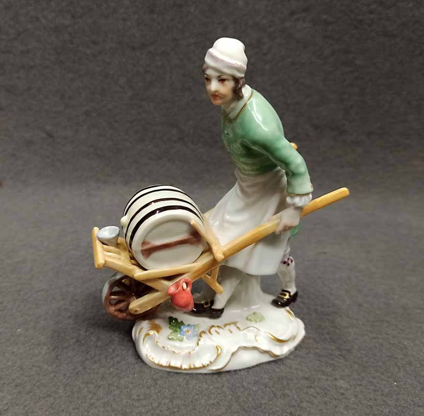 Meissen Figur aus der Serie Pariser Ausrufer, hier: Essighändler. Entwurf von Johann Joachim Kaendler. Unterglasurblaue Schwertmarke von Meissen 1. Wahl ohne Schleifstriche. Tadelloser Zustand ohne Beschädigungen. H. 13,5 cm. Formnummer 60252.