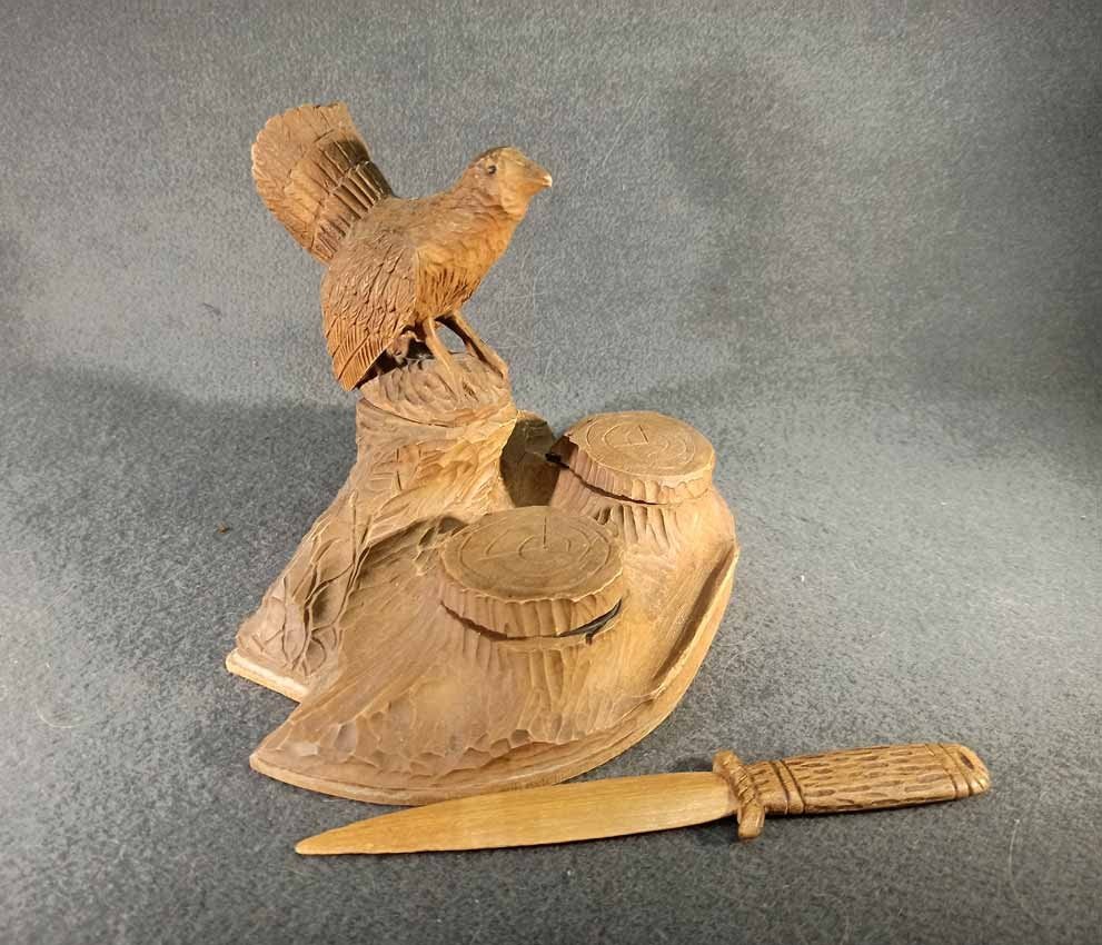 Schreibgarnitur mit Brieföffner, Holz geschnitzt, Jagd- bzw. Naturmotiv. L. x B. 24 x 13 cm, H. 16 cm