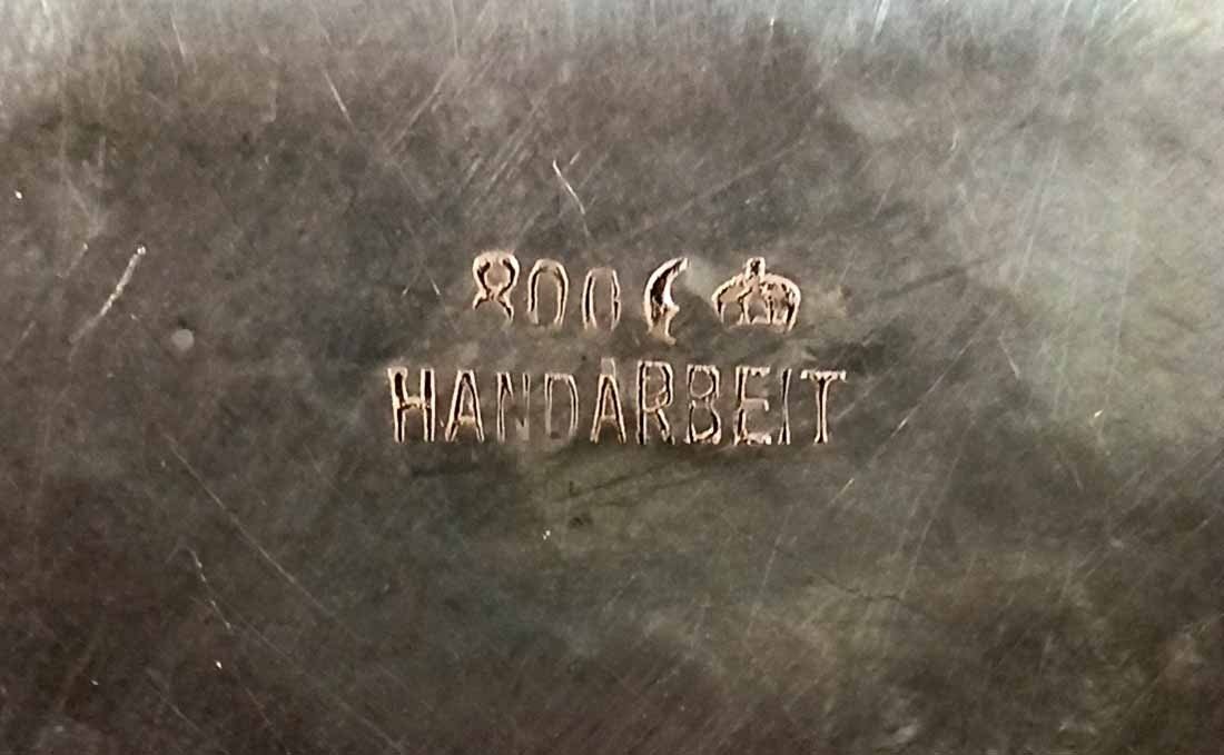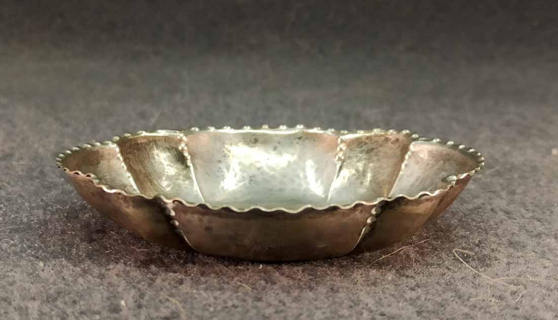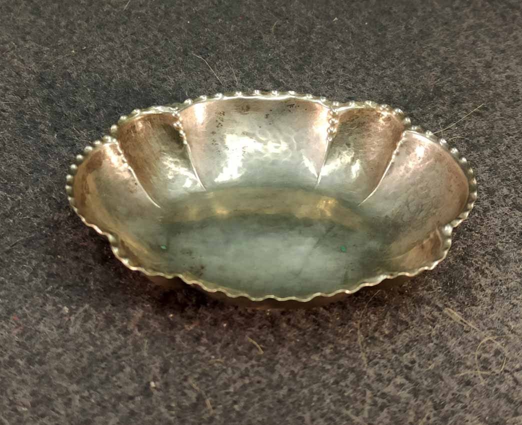 Kleine Silberschale, 800er Silber, Hand gearbeitet. Gestempelt 800, Symbole Mond und Krone sowie Handarbeit. L. x B. 7,5 x 9 cm, ca 26 g